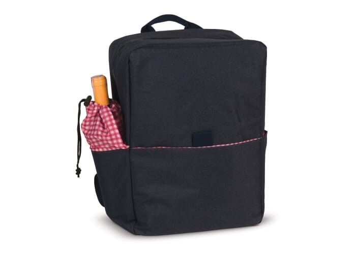 Stijlvolle rugzak gemaakt van R-PET met gemêleerd effect. Deze geïsoleerde tas houdt eten en drinken koel onderweg naar een picknick. De gladde geruite voering is eenvoudig schoon te houden en geeft een verrassend effect aan deze moderne rugzak. Aan één zijde is een speciaal vak voor een fles wijn geplaatst. De rugzak wordt geleverd met een volledige set borden en bestek voor 2 personen (bord, glas, vork/mes/lepel).
