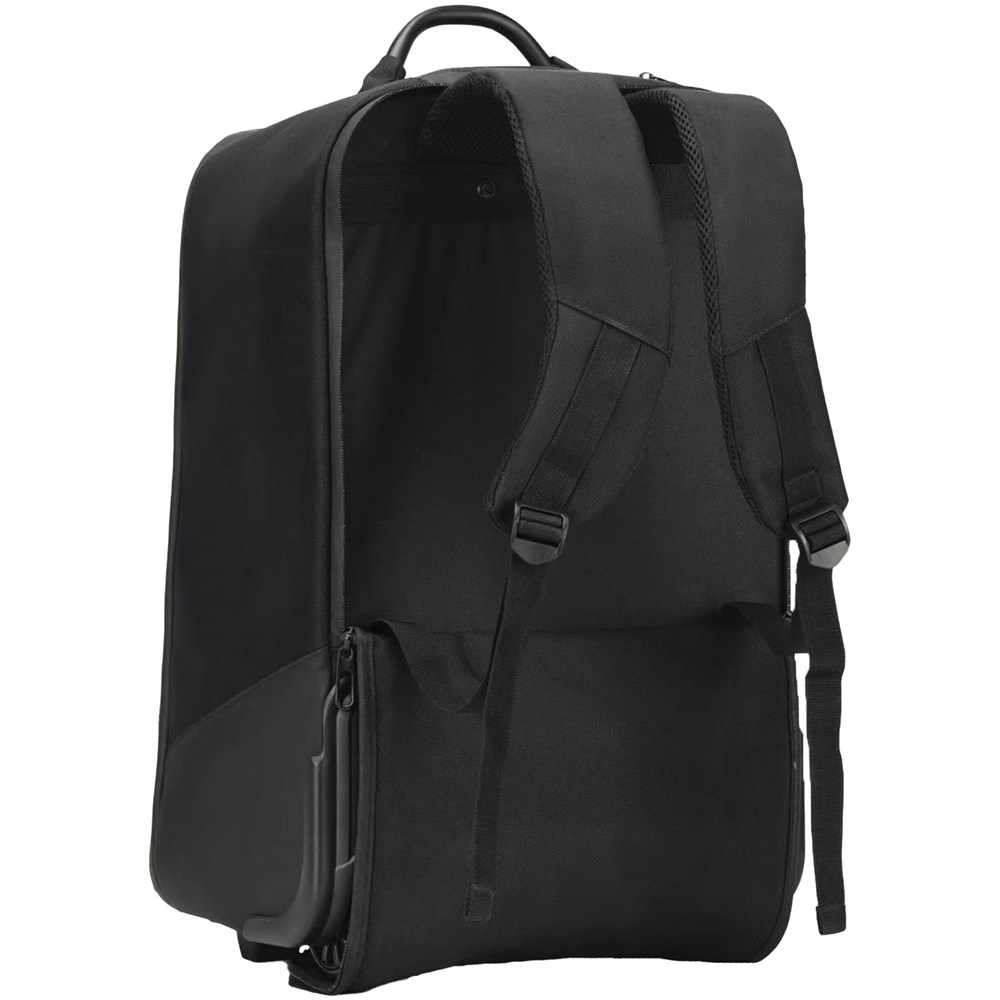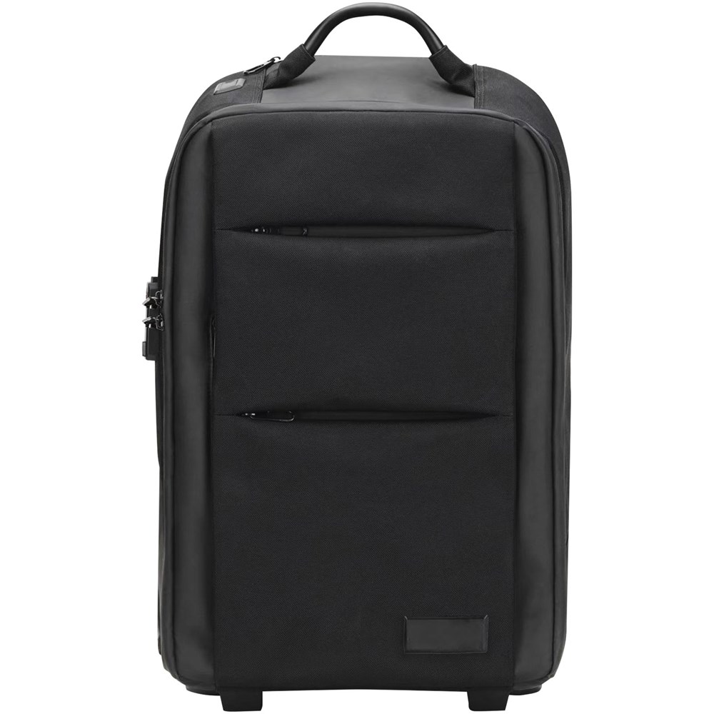 Converteerbare laptop trolleyrugzak (55 x 34 x 22 cm) gemaakt van gerecycled PET (equivalent van 31 gerecyclede flessen) met 1680D waterdichte stof. Niet-vervormbare structuur en gewatteerde bodem voor een goede bescherming van de inhoud van de tas. Voorzien van een gewatteerd compartiment voor een laptop of tablet, een metalen handvat en een verwijderbare powerbank voor de beveiliging op de luchthaven. Uitgerust met een RFID-beveiligd vak en een hangslot om de inhoud veilig te houden. Via een vak aan de achterkant kunt u de banden vrijmaken om de trolley in een rugzak te veranderen. Voorzien van een 10.000 mAh snelladende powerbank en een lichtgevende oplaadkabel van rPET. Met deze kabel kan de powerbank direct worden opgeladen met de USB-/Android-connector buiten op de tas (zonder de powerbank te hoeven verwijderen). Bedrukking mogelijk zowel op de voorplaat als op één zijde van de 3-in-1 kabel van rPET. Geleverd met een opberghoes.