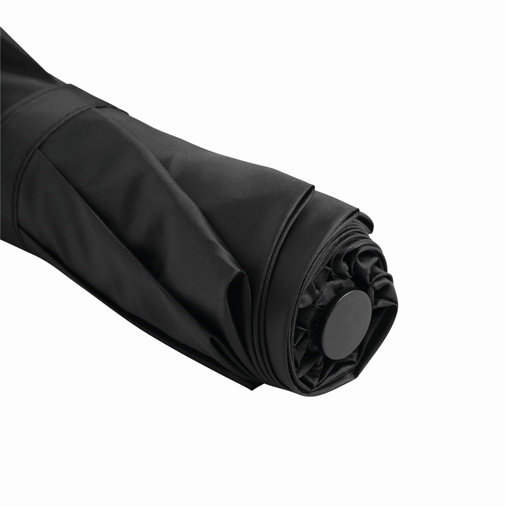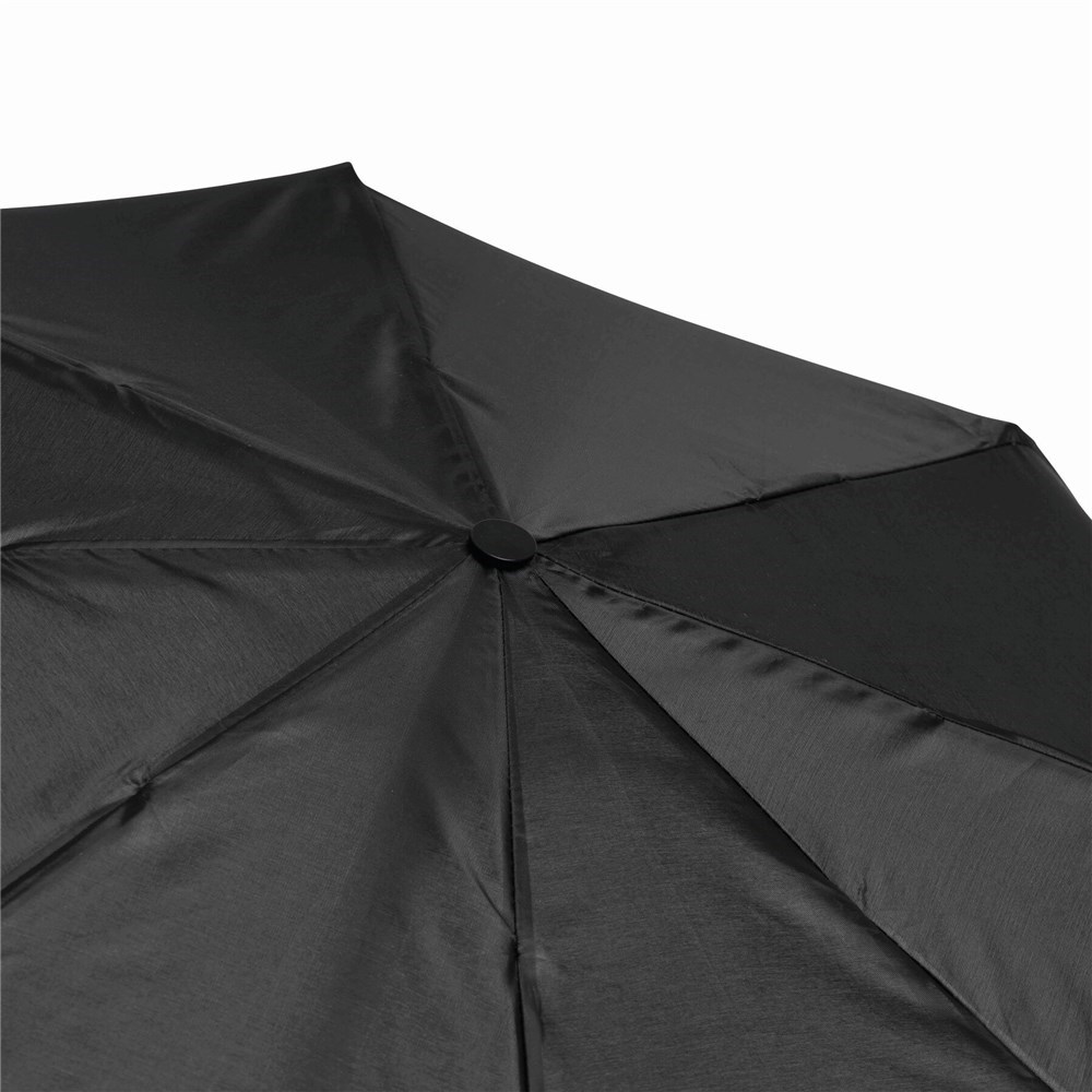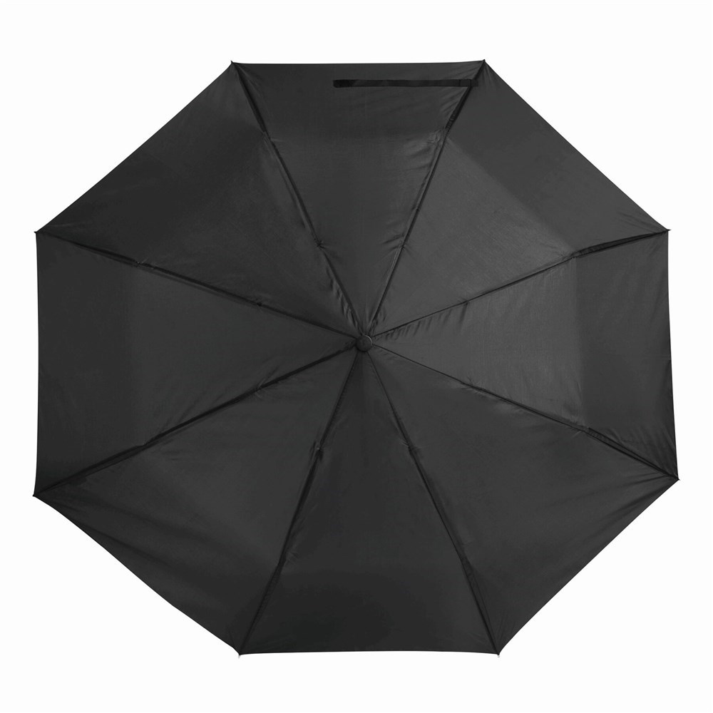 Automatisch te openen opvouwbare paraplu PRIMA bestaande uit 3 secties met metalen baleinen en tips, zwart kunststof handvat, polyester cover en bijpassende opberghoes.