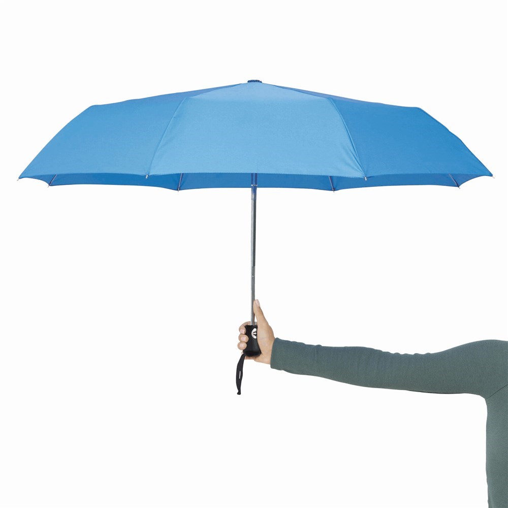 Stormvaste, automatisch te openen- en sluiten, uit 3 secties bestaande opvouwbare paraplu BORA met baleinen van aluminium, kunststof en fiberglas en rubbercoated grip. Polyester-pongee cover met waterafstotende coating.