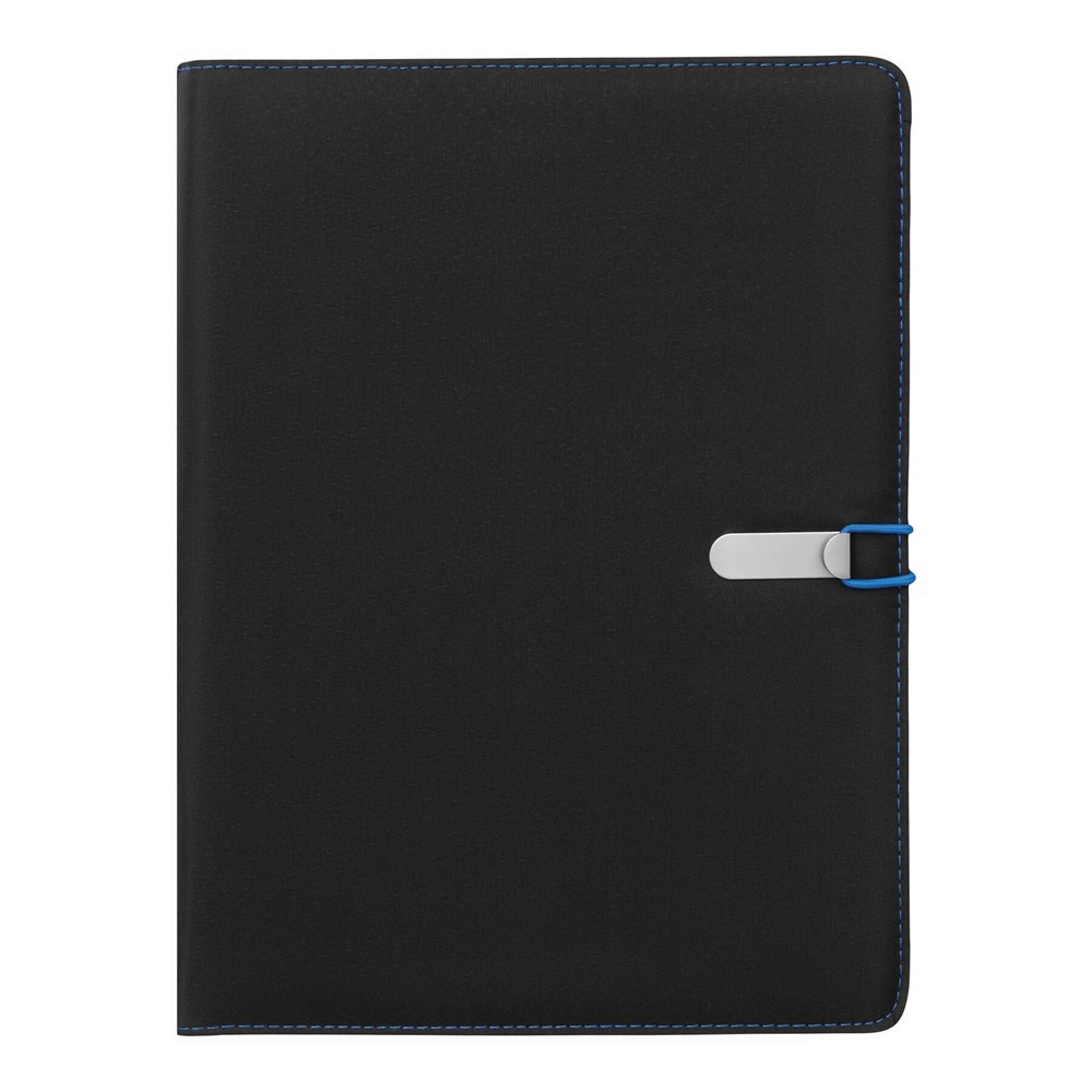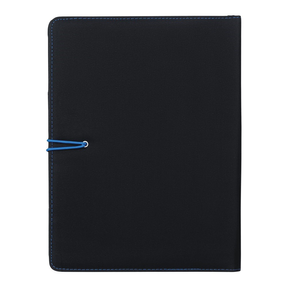 A4-schrijfmap SESSION van microfiber met schrijfblok, diverse opbergvakken, penhouder en een gekleurde elastische sluitband met metalen haak.