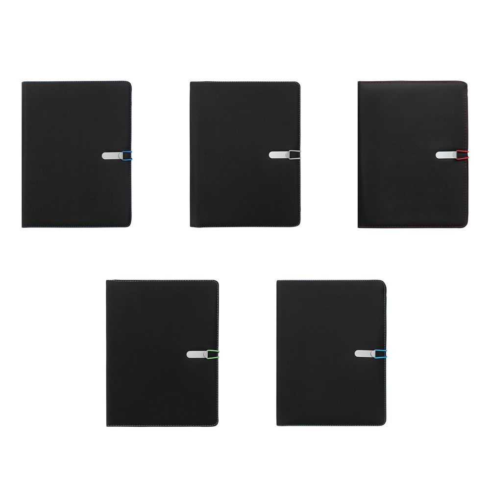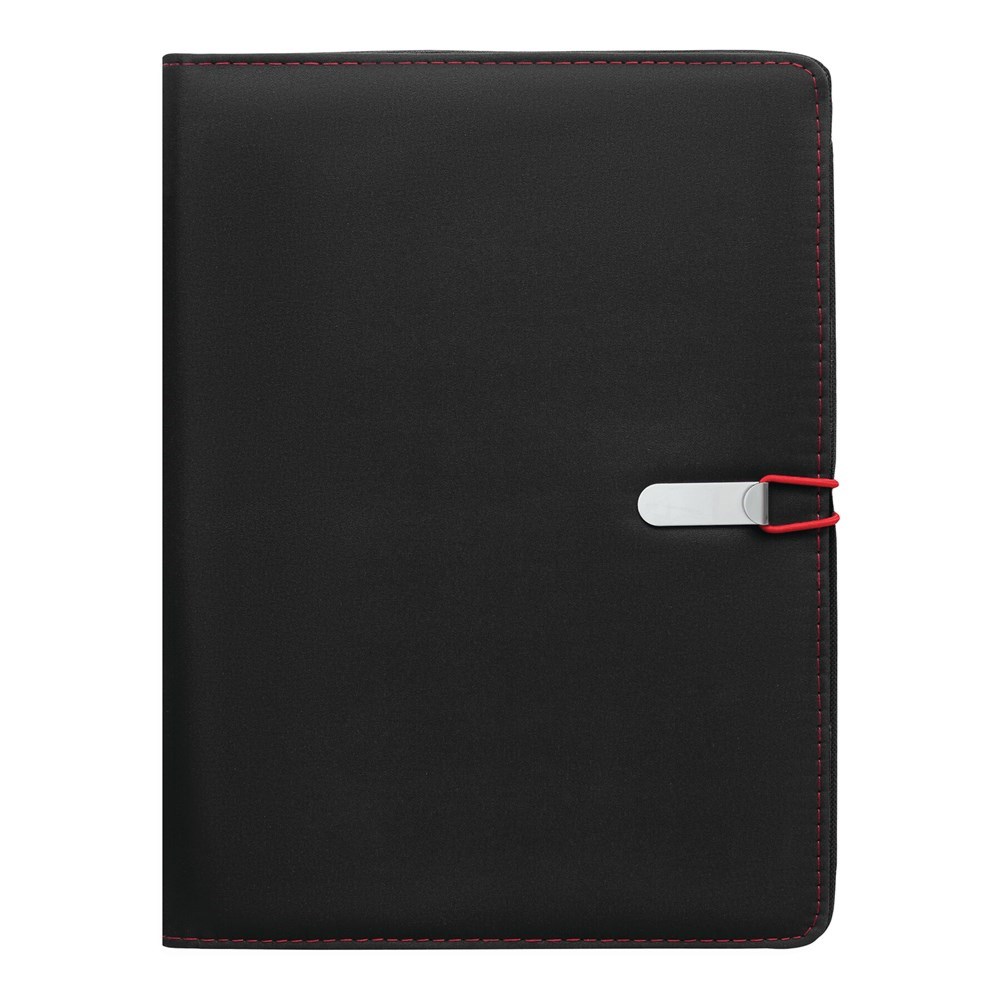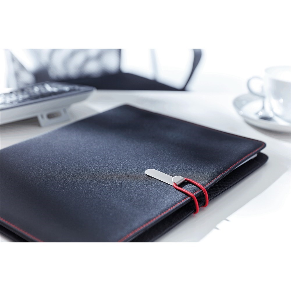 A4-schrijfmap SESSION van microfiber met schrijfblok, diverse opbergvakken, penhouder en een gekleurde elastische sluitband met metalen haak.