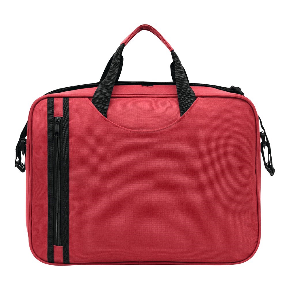 Documententas BUSY met, dmv rits afsluitbaar hoofdvak, een voorvak met verticale rits en een insteekvak. Voorts stevige handvatten en een afneembare- en verstelbare schouderband.