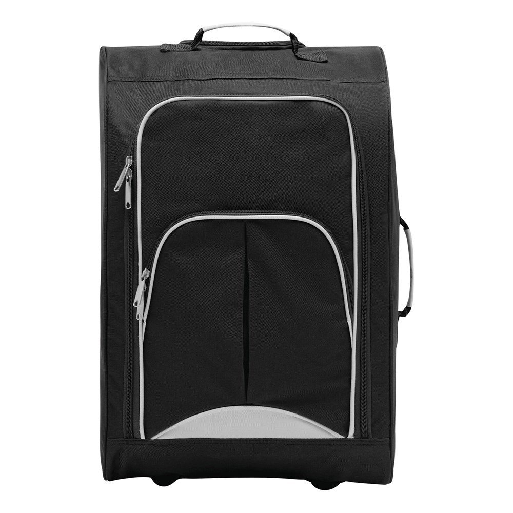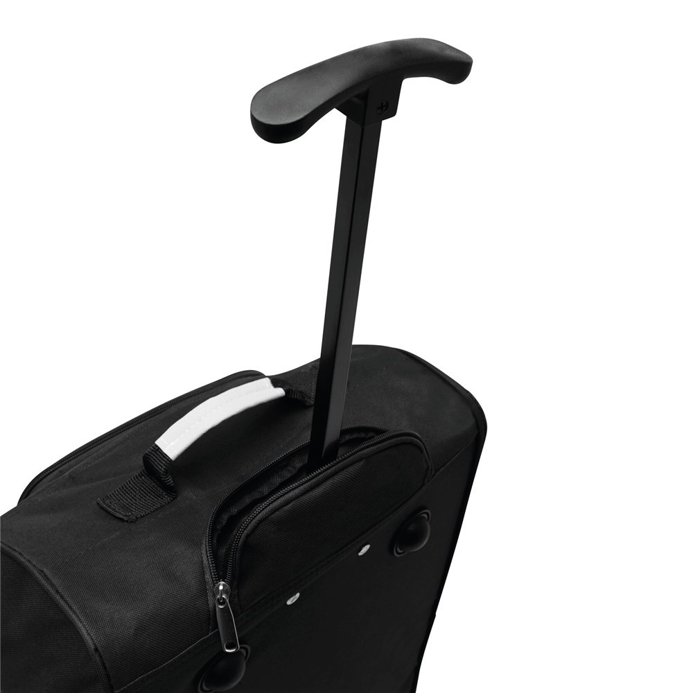 Trolley-boardcase van 600D polyester VIENNA. Hoofd- en voorvak dmv rits afsluitbaar, 2 draagrepen, 2 steunen aan de achterzijde en lichtlopende skatewielen. Het trolleysysteem kan volledig in een dmv rits afsluitbaar vak verzonken worden. Afmetingen geschikt voor de meeste low-budget airlines.