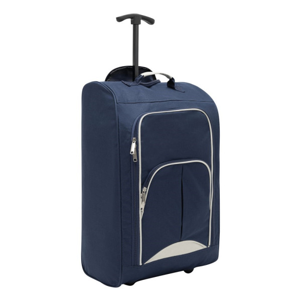 Trolley-boardcase van 600D polyester VIENNA. Hoofd- en voorvak dmv rits afsluitbaar, 2 draagrepen, 2 steunen aan de achterzijde en lichtlopende skatewielen. Het trolleysysteem kan volledig in een dmv rits afsluitbaar vak verzonken worden. Afmetingen geschikt voor de meeste low-budget airlines.