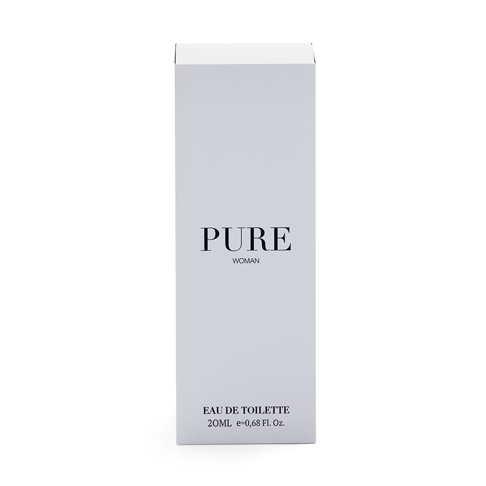 Eau de toilette voor vrouwen Pure. Een perfecte mix van zoete noten die het moderne silhouet van de compositie accentueren en zorgen voor een omarmende sensatie. In 20 ml navulbare sprayflacon met transparante dop. Gepresenteerd in een premium design doos.