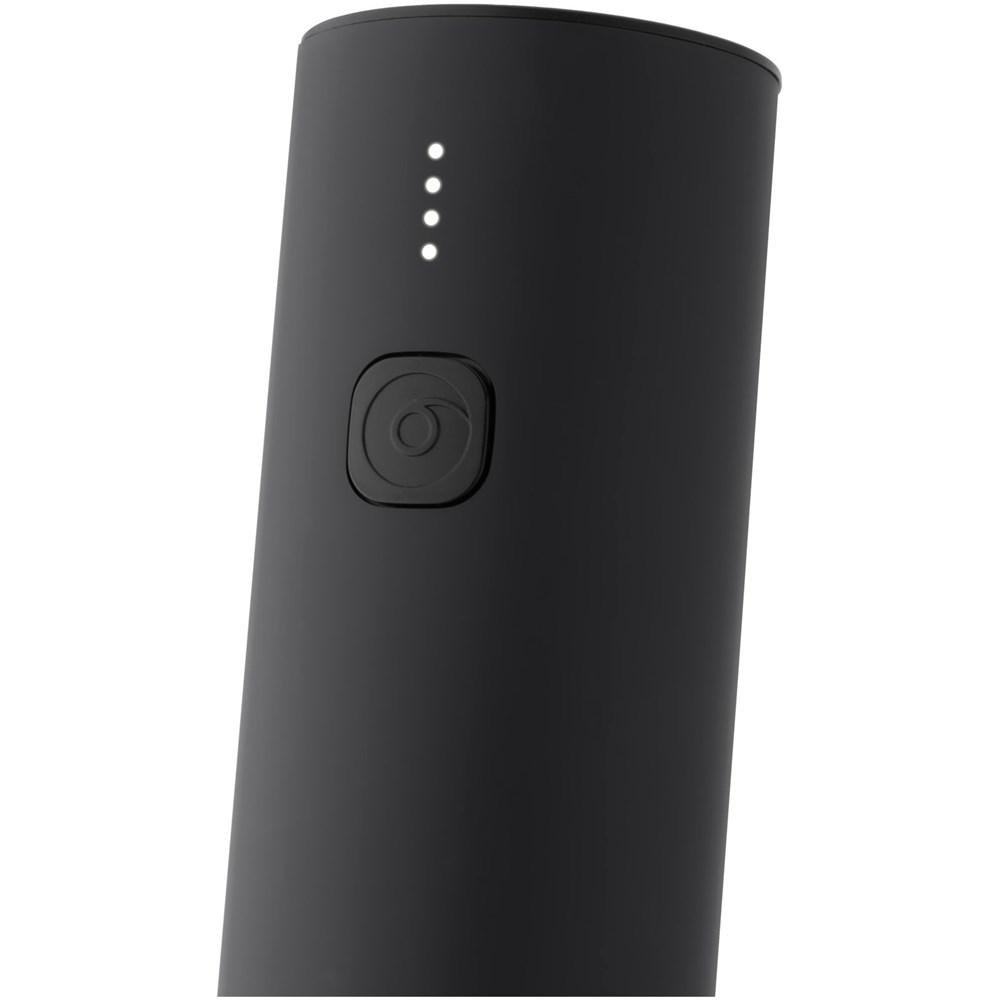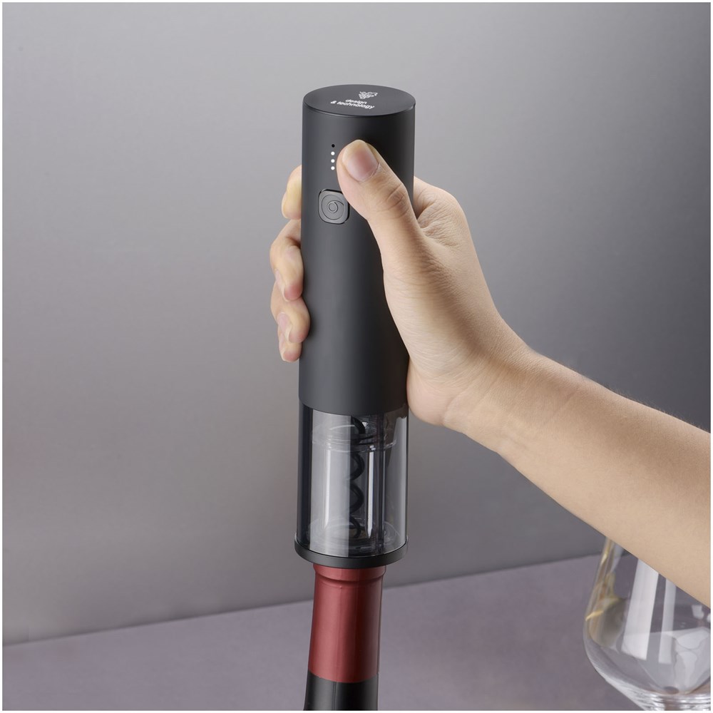 Elektrische kurkentrekker (18,8 x 4,4 cm) om zonder moeite een fles wijn in ongeveer acht seconden te openen. De bovenkant van de kurkentrekker kan met een oplichtend logo worden gepersonaliseerd. Hij heeft een geïntegreerde batterij van 500 mAh die met een USB-C-connector wordt opgeladen. De kurkentrekker kan tot 50 flessen openen met slechts eenmaal opladen. Een blauw ledlichtje geeft aan wanneer hij is ingeschakeld. De basis zorgt voor een goede stabiliteit van het apparaat en dient ook als een foliesnijder. Verpakt in een doos van gerecycled kraftpapier (20 x 7,2 x 5,8 cm). Inclusief 3 jaar garantie.