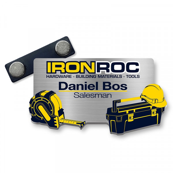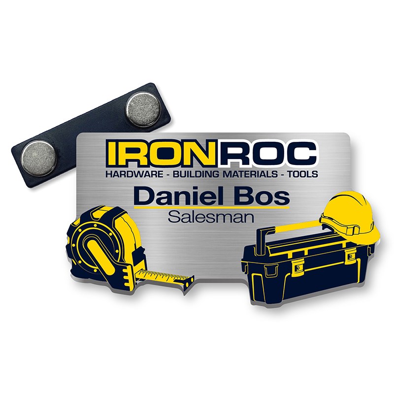 Naambadge gemaakt van 2 mm dik plexiglas. Deze badge kun je volledig op maat laten maken waardoor je dus vrij bent om de vorm te bepalen. Laat elementen van een huisstijl terugkomen of gebruik gewoon een leuke vorm. Het kunststof wordt aan de achtergkant met krasvaste UV-inkten bedrukt met hoge resolutie. Dat is strak werk dus! De bevestiging aan je kleding gaat een magneet of speldsluiting.