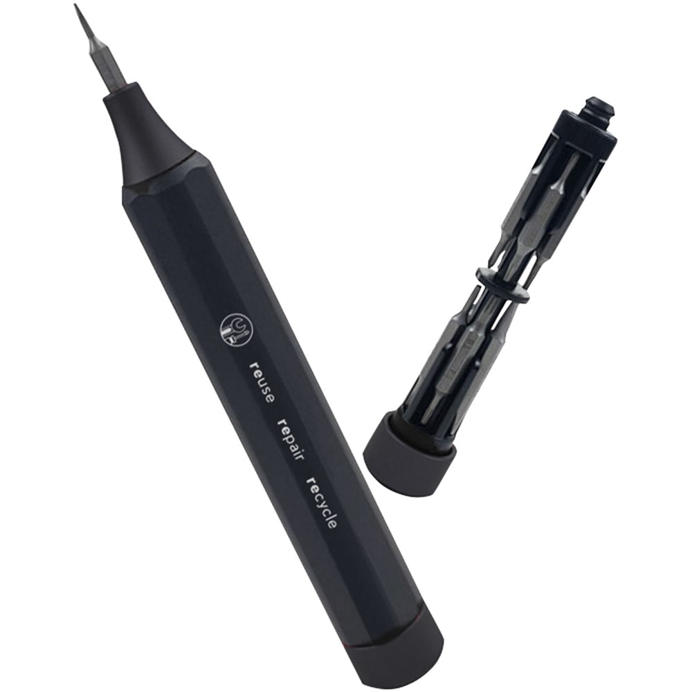 Precisie schroevendraaierset in aluminium, voorzien van daarin verborgen 10-dubbelkoppige bits. De verschillende bits worden met een magnetische functie aan de schroevendraaierpen bevestigd en zijn geschikt voor de meeste technische apparaten. Dit product is aanpasbaar met lasergraveren. Geleverd in een geschenkverpakking van gerecycled papier.
