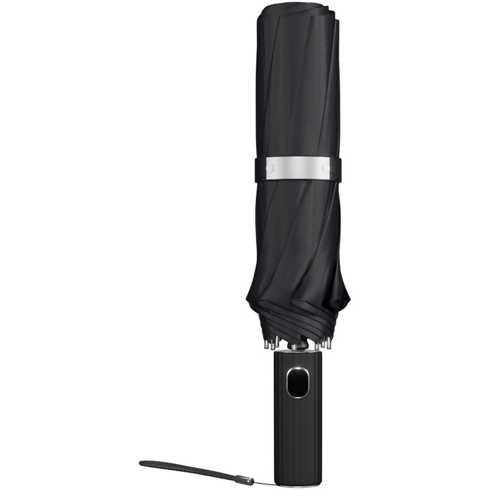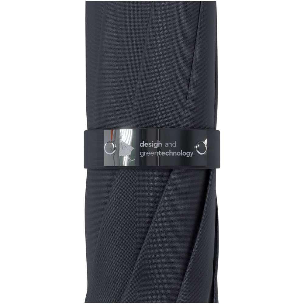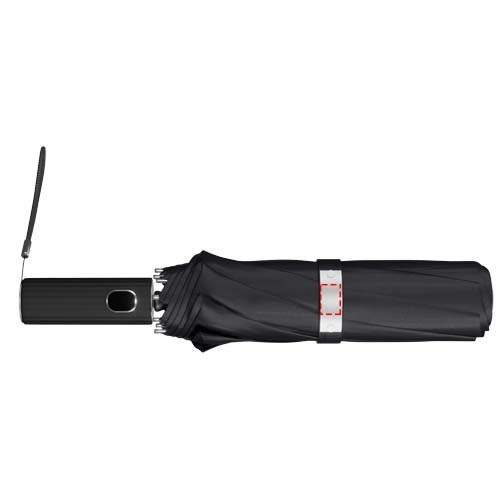 Halfautomatische, opvouwbare paraplu gemaakt met rPET 210T pongee en een glasvezelframe. Zacht aanvoelende handgreep met geïntegreerde drukknop voor snel openen en sluiten. Winddicht systeem voor betere windweerstand dankzij het flexibele frame. Dit product kan worden voorzien van een logo op de exclusieve metalen plaat met knoppen. Geleverd met een parapluzakje en in een cilindrische geschenkverpakking van gerecycled papier (32 x 6,5 cm).