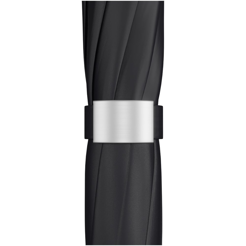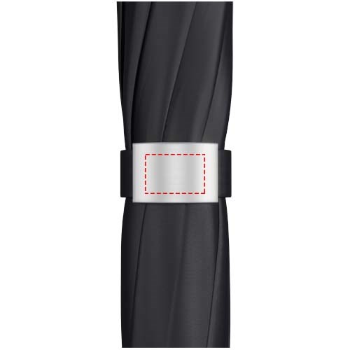 Golfparaplu gemaakt met rPET 210T pongee en glasvezelframe. Zacht aanvoelende handgreep met geïntegreerde drukknop voor snel openen. Winddicht systeem voor een betere windbestendigheid dankzij het flexibele frame. Dit product kan worden voorzien van een logo op de exclusieve metalen plaat met knoppen. Geleverd met een parapluzakje en in een cilindrische geschenkverpakking van gerecycled papier (96 x 5,5 cm).