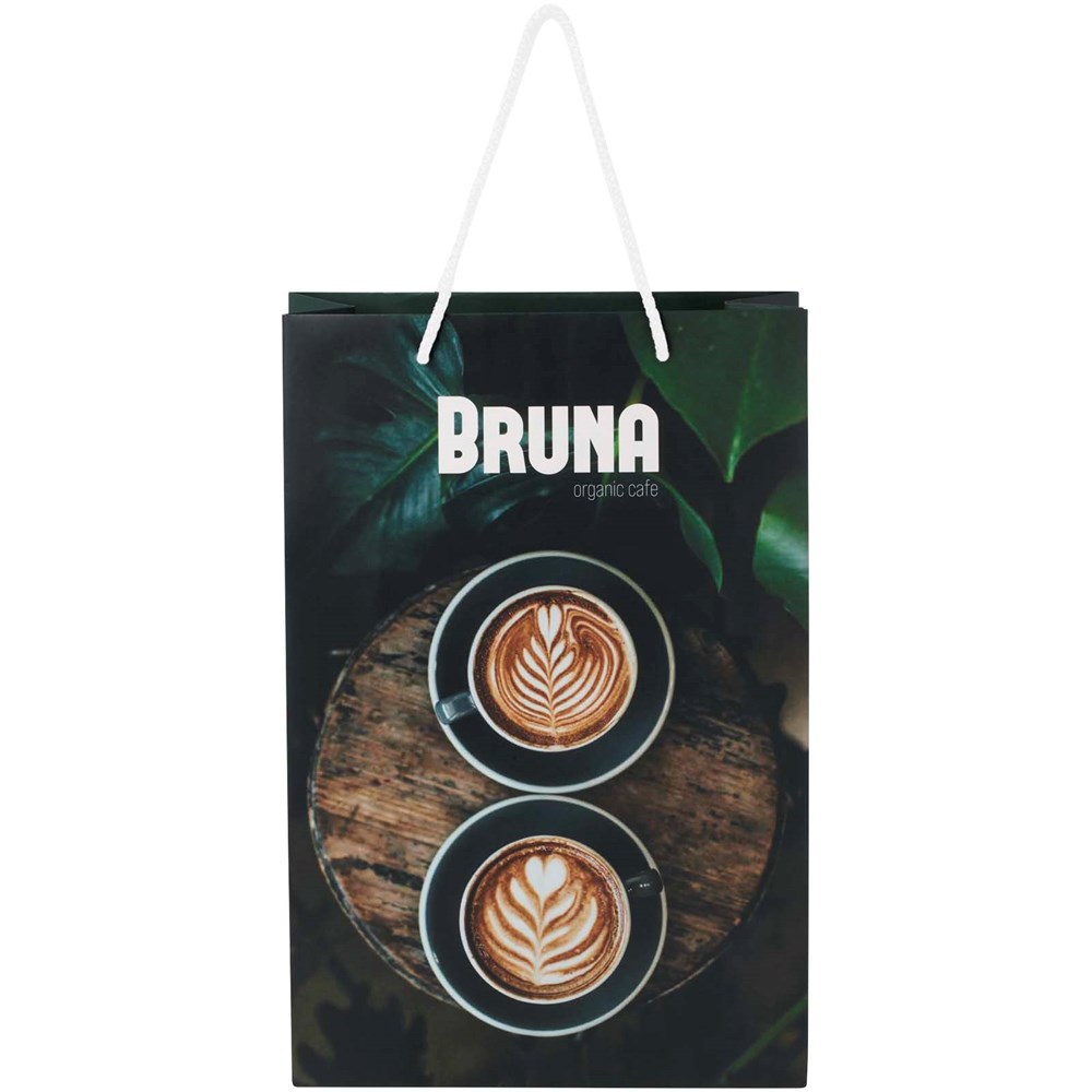Grote handgemaakte matte integra papieren tas (24 x 9 x 36 cm) van 170 g/m2 met PP woven handgrepen. De aanpasbare voor- en achterkant bieden voldoende ruimte voor het afdrukken van een logo of een ander ontwerp, waardoor het een uitstekende zakelijke marketingtool is. Gemaakt in Europa en 100% recyclebaar.