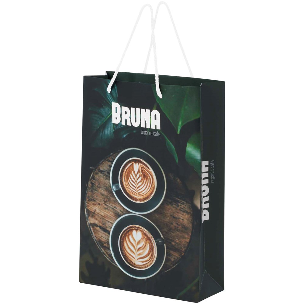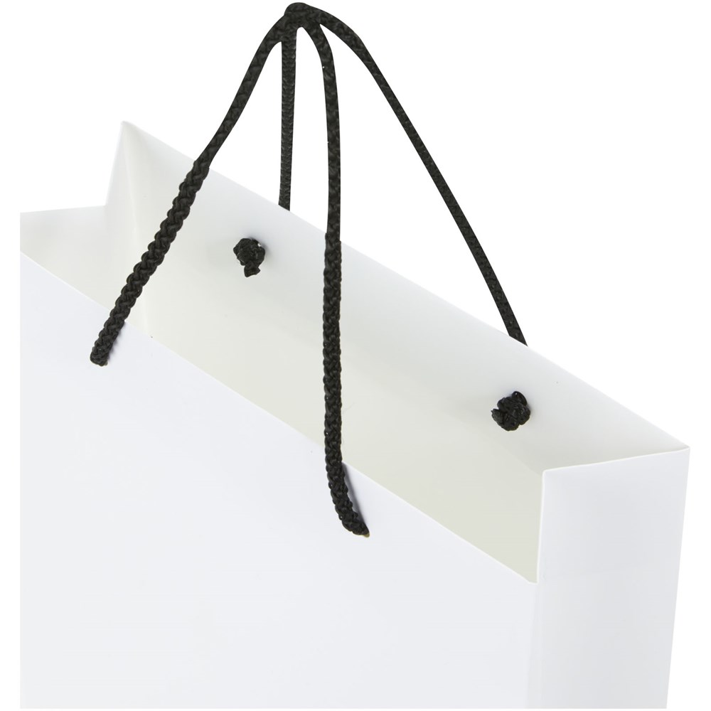 Grote handgemaakte matte integra papieren tas (24 x 9 x 36 cm) van 170 g/m2 met PP woven handgrepen. De aanpasbare voor- en achterkant bieden voldoende ruimte voor het afdrukken van een logo of een ander ontwerp, waardoor het een uitstekende zakelijke marketingtool is. Gemaakt in Europa en 100% recyclebaar.