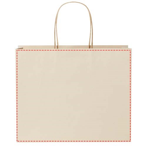 Grote 150 g/m2 papieren tas (31 x 12 x 25 cm) gemaakt van landbouwafval met gedraaide papieren handgrepen. De aanpasbare voor- en achterkant bieden voldoende ruimte voor het afdrukken van een logo of een ander ontwerp, waardoor het een uitstekende zakelijke marketingtool is. Gemaakt in Europa en 100 % recyclebaar, waardoor deze tas een duurzamere keuze is voor milieubewuste bedrijven en mensen die op zoek zijn naar een duurzame verpakkingsoplossing.