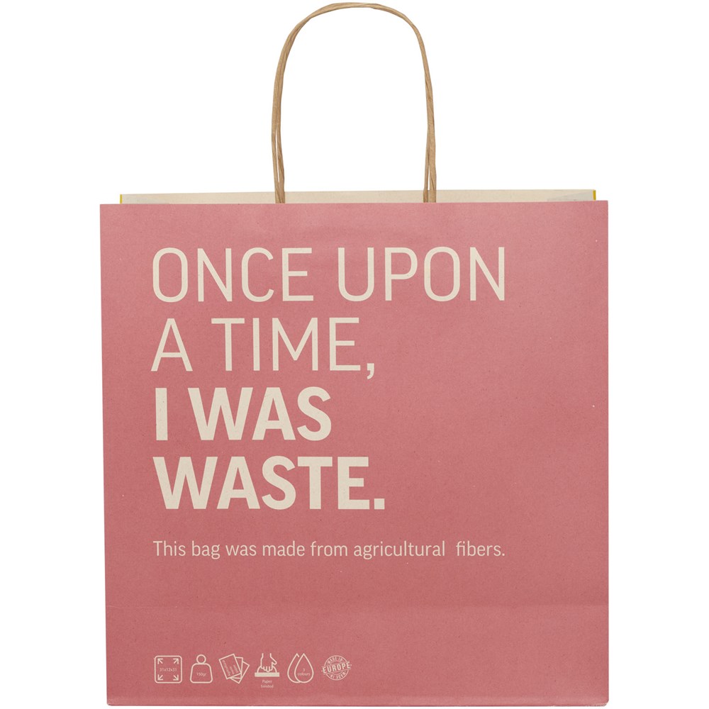 XL 150 g/m2 papieren tas (31 x 12 x 31 cm) gemaakt van landbouwafval met gedraaide papieren handgrepen. De aanpasbare voor- en achterkant bieden voldoende ruimte voor het afdrukken van een logo of een ander ontwerp, waardoor het een uitstekende zakelijke marketingtool is. Gemaakt in Europa en 100 % recyclebaar, waardoor deze tas een duurzamere keuze is voor milieubewuste bedrijven en mensen die op zoek zijn naar een duurzame verpakkingsoplossing.