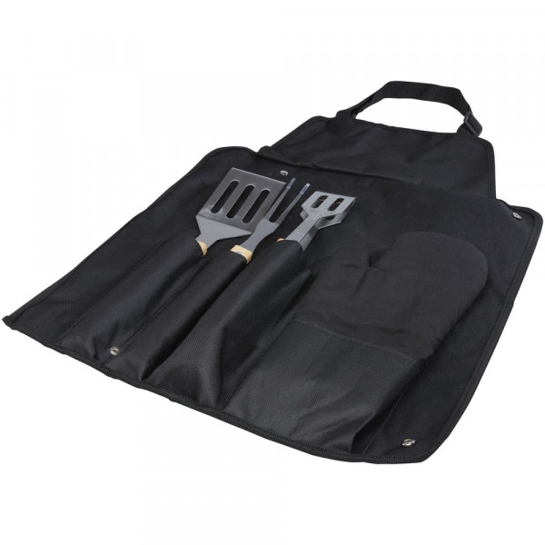 5-delige barbecueset met een schop (36,5 x 7 cm), vork (36,5 x 2 cm), tang (36,5 x 5 cm), handschoen (25 x 16 cm) en een schort inclusief etui (42 x 60 cm). De handgrepen zijn gemaakt van bamboe dat is ingekocht en geproduceerd volgens duurzame normen.