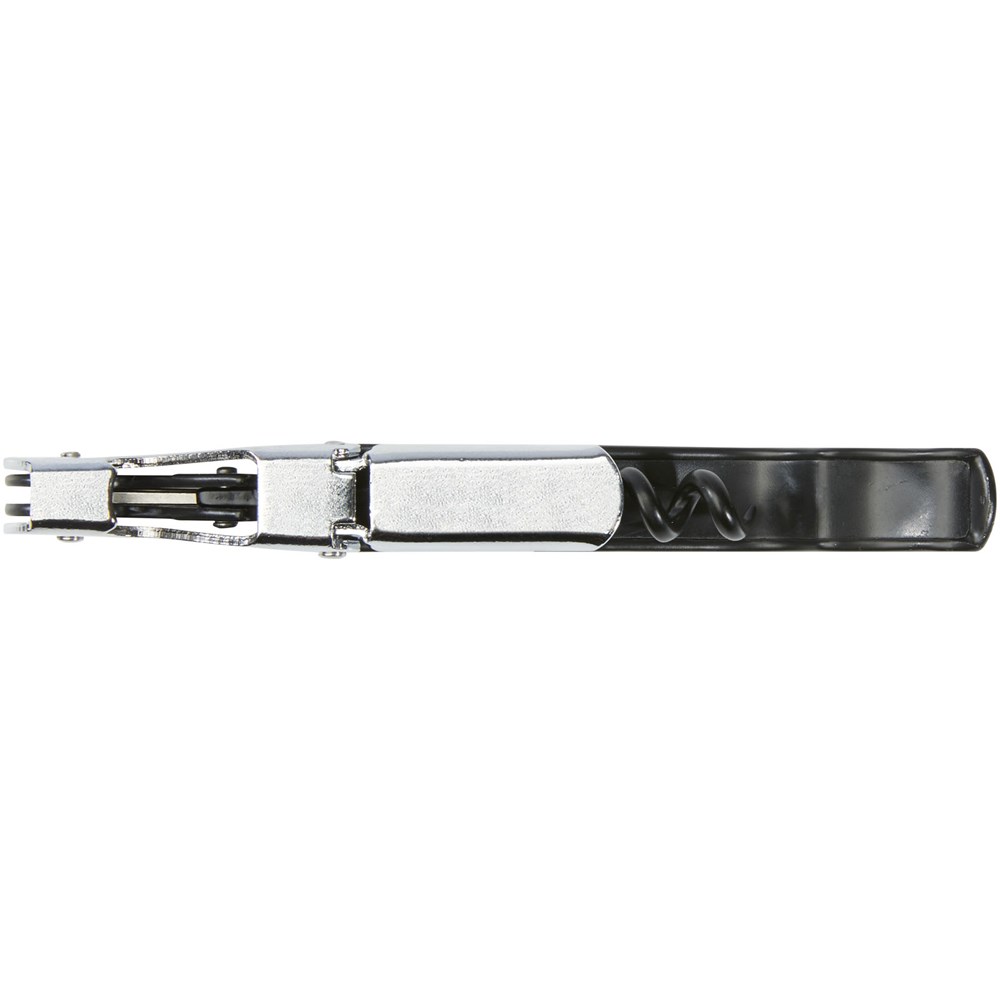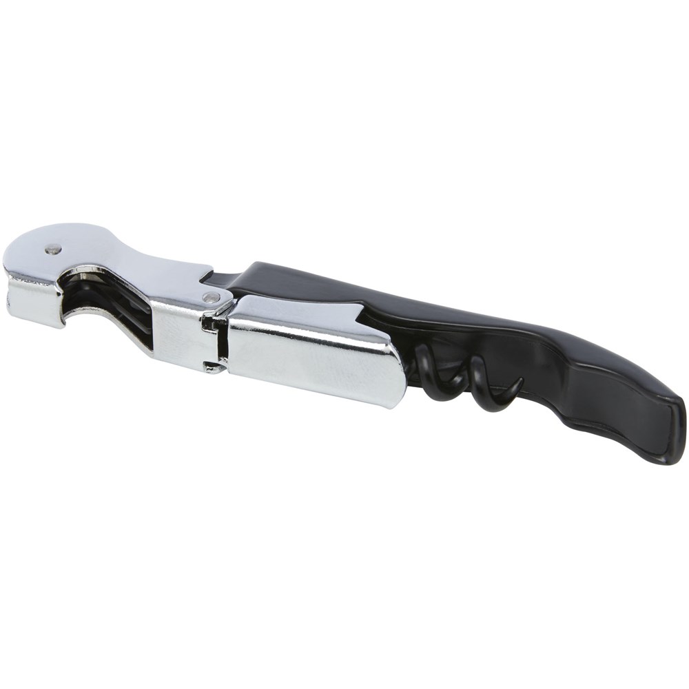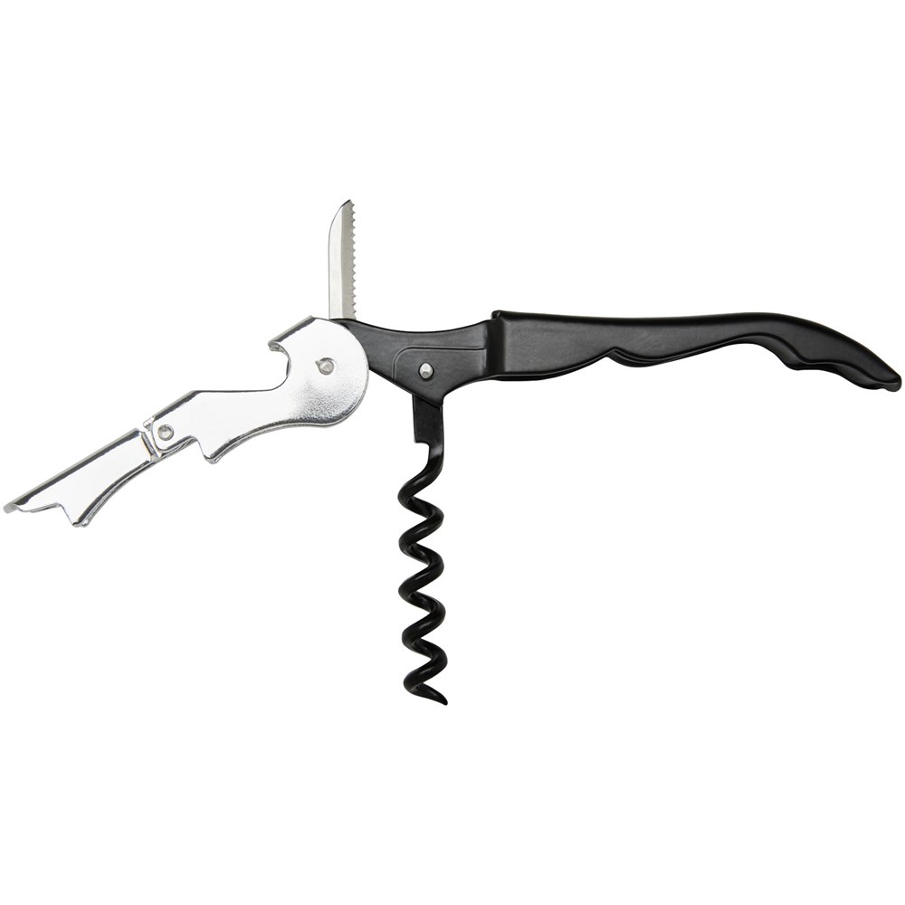 Roestvrijstalen sommeliermes met een gekleurde behuizing, met een kurkentrekker, foliesnijder en flesopener. Door de tweestapsconstructie is het gemakkelijk om de kurk uit de fles te trekken.