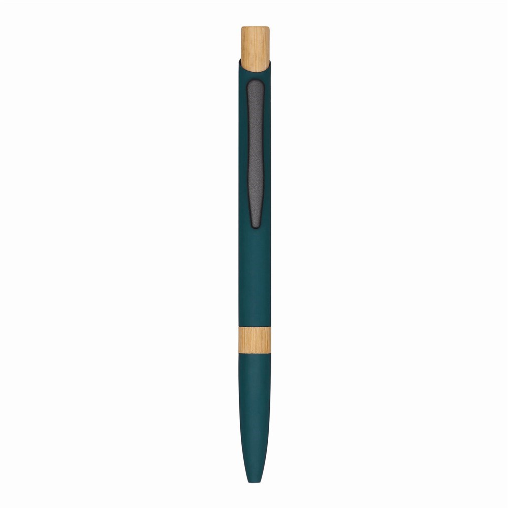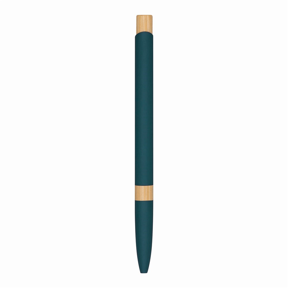 Aluminium balpen BAMBOO SYMPHONY: matte metalen behuizing, gemaakt van gerecycled aluminium, ring boven de grip, drukknop van bamboe, grote blauwschrijvende vulling.