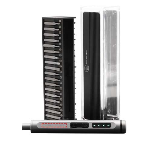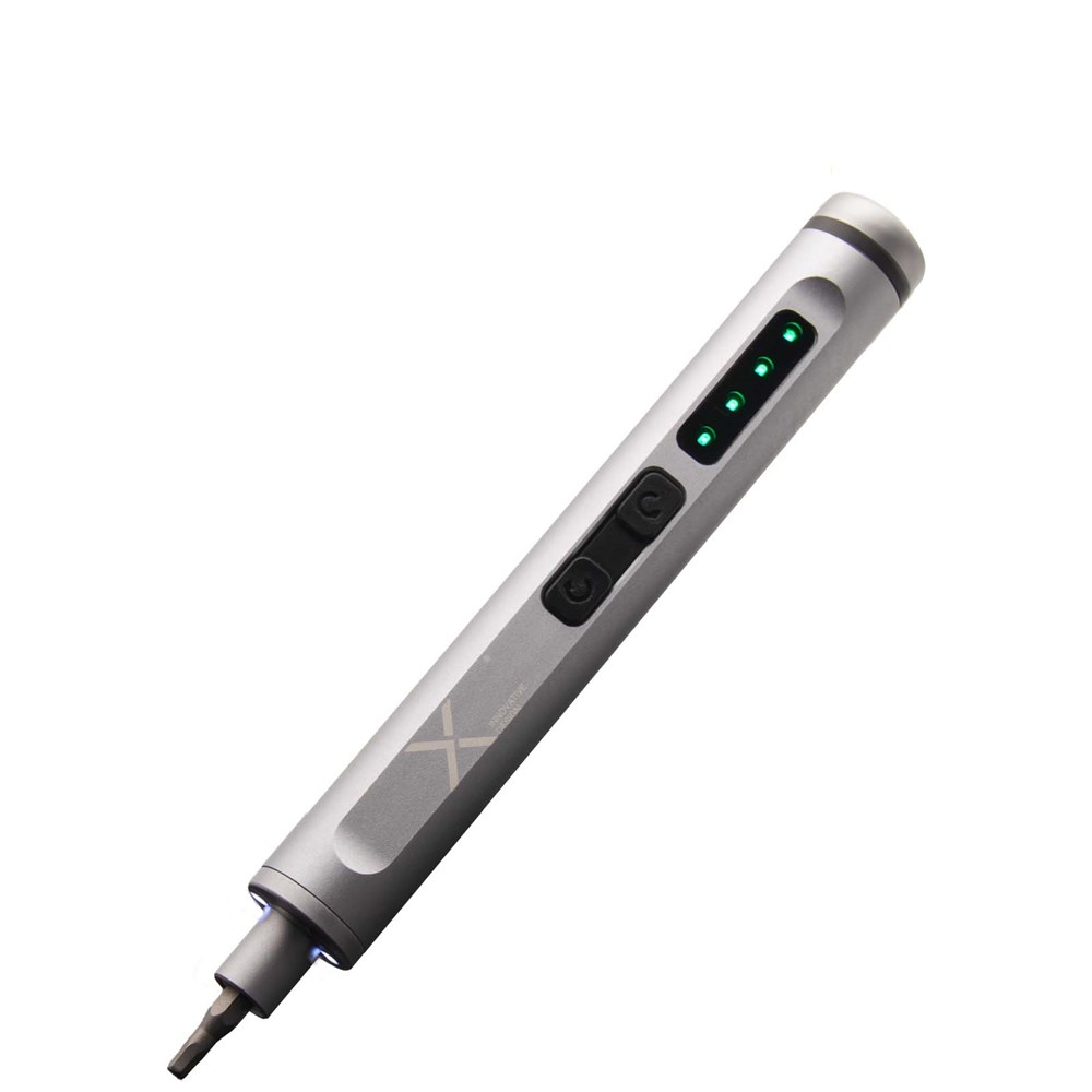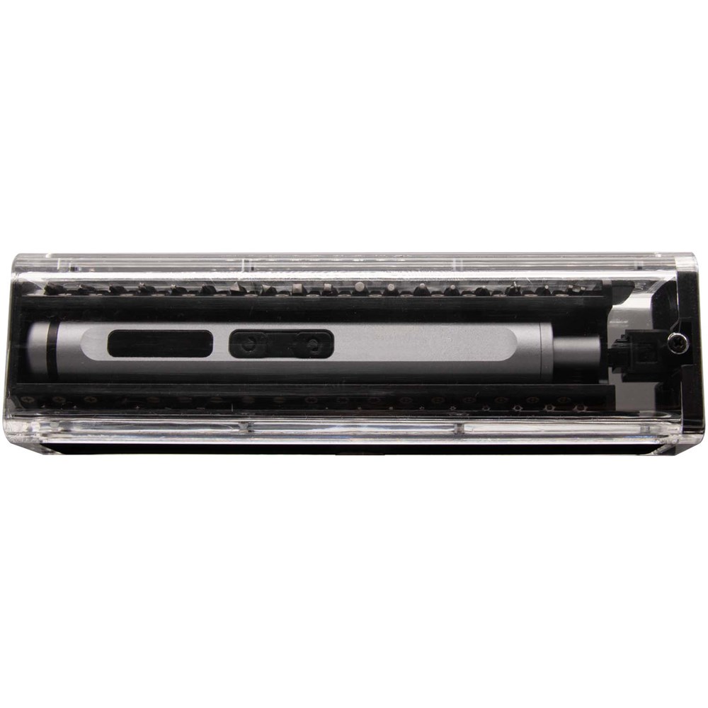 Set met een elektrische schroevendraaier van aluminium en 40 bits voor het repareren van kleine apparaten en andere doe-het-zelf-activiteiten. De bits worden magnetisch door de schroevendraaier aangetrokken. Het logo 'REUSE REPAIR RECYCLE' is gegraveerd op de opbergdoos. Gepresenteerd in een gerecyclede kartonnen geschenkverpakking.