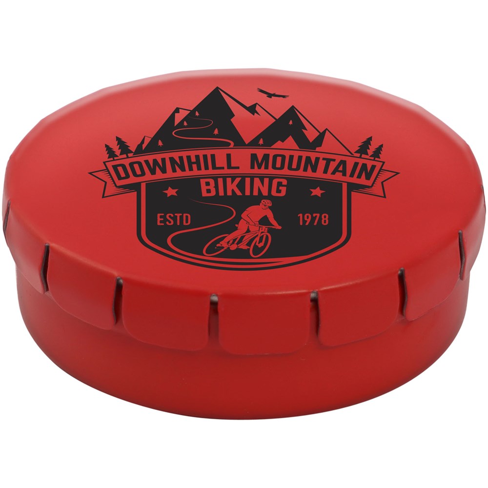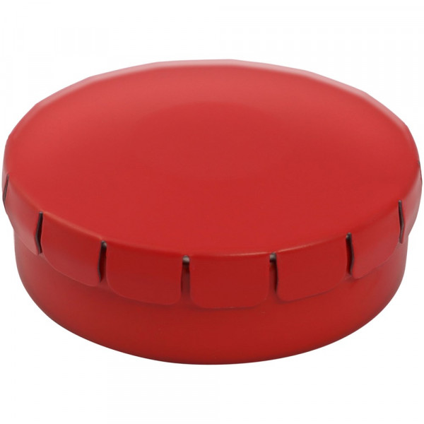 Natuurlijke pepermuntjes in blik met gemakkelijke drukopening. Kan worden besteld in een breed scala van kleuren en gevuld met verschillende vullingen: pepermunt, extra sterke pepermunt, suikervrije pepermunt, fruitsmaak, hartvormige aardbeiensnoepjes, kaneel-, citroen- en pepermuntsmaak, of chocolade. Kan worden gedecoreerd met een full colour digitale print op het deksel.