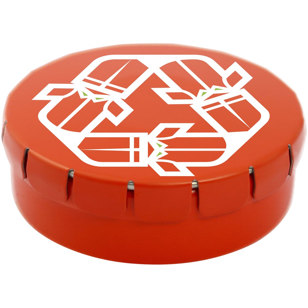 Natuurlijke pepermuntjes in blik met gemakkelijke drukopening. Kan worden besteld in een breed scala van kleuren en gevuld met verschillende vullingen: pepermunt, extra sterke pepermunt, suikervrije pepermunt, fruitsmaak, hartvormige aardbeiensnoepjes, kaneel-, citroen- en pepermuntsmaak, of chocolade. Kan worden gedecoreerd met een full colour digitale print op het deksel.