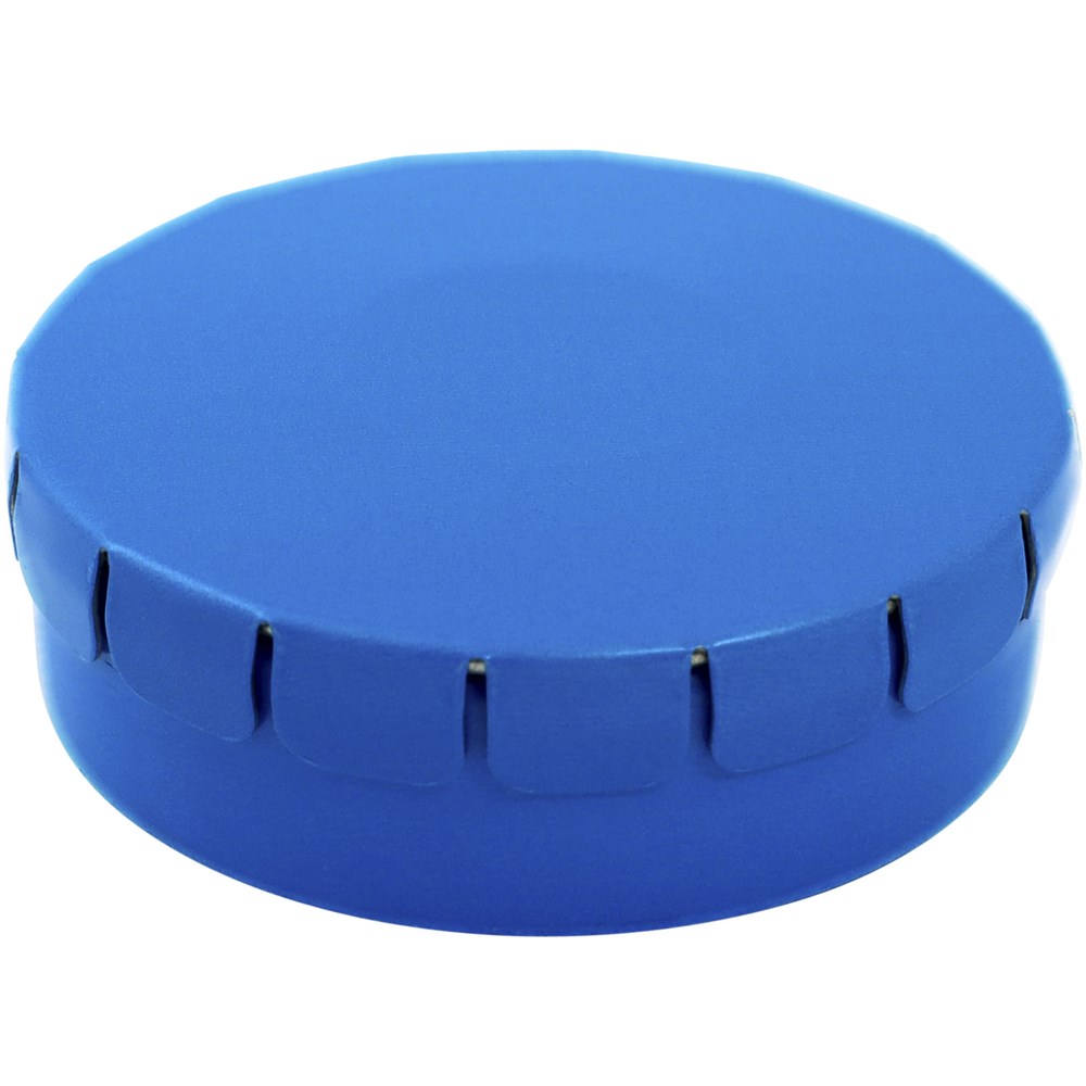Natuurlijke pepermuntjes in blik met gemakkelijke drukopening. Kan worden besteld in een breed scala van kleuren en gevuld met verschillende vullingen: pepermunt, extra sterke pepermunt, suikervrije pepermunt, fruitsmaak, hartvormige aardbeiensnoepjes, kaneel-, citroen- en pepermuntsmaak, of chocolade. Kan worden gedecoreerd met een full colour digitale print op het deksel.