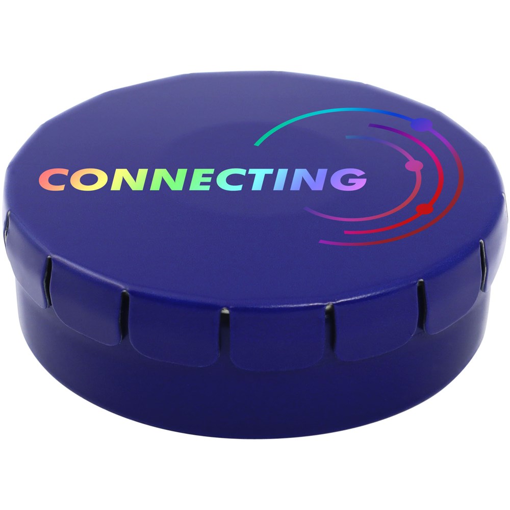 Natuurlijke pepermuntjes in blik met gemakkelijke drukopening. Kan worden besteld in een breed scala van kleuren en gevuld met verschillende vullingen: pepermunt, extra sterke pepermunt, suikervrije pepermunt, fruitsmaak, hartvormige aardbeiensnoepjes, kaneel-, citroen- en pepermuntsmaak, of chocolade. Kan worden gedecoreerd met een full colour digitale print op het deksel.