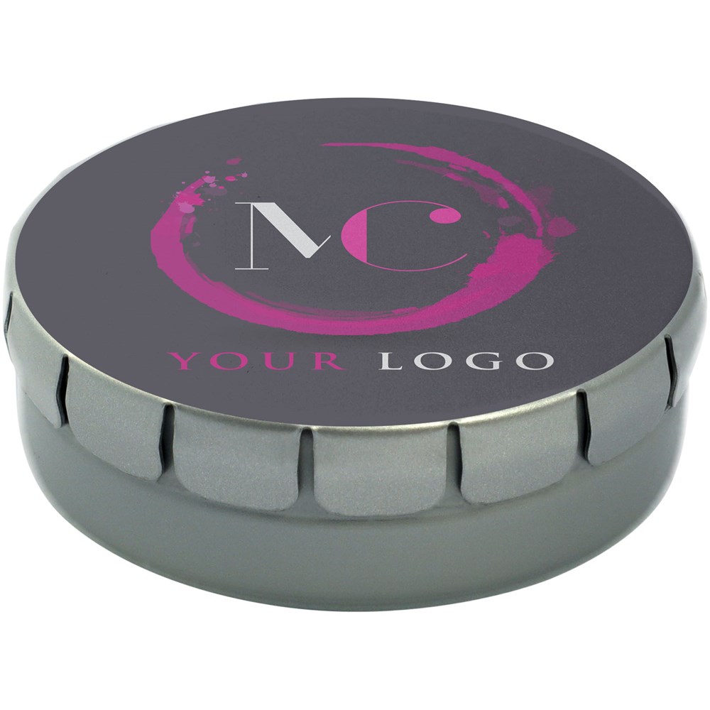 Natuurlijke pepermuntjes in blik met gemakkelijke drukopening. Kan worden besteld in een breed scala van kleuren en gevuld met verschillende vullingen: pepermunt, extra sterke pepermunt, suikervrije pepermunt, fruitsmaak, hartvormige aardbeiensnoepjes, kaneel-, citroen- en pepermuntsmaak, of chocolade. Kan worden gedecoreerd met een full colour digitale print op het deksel.