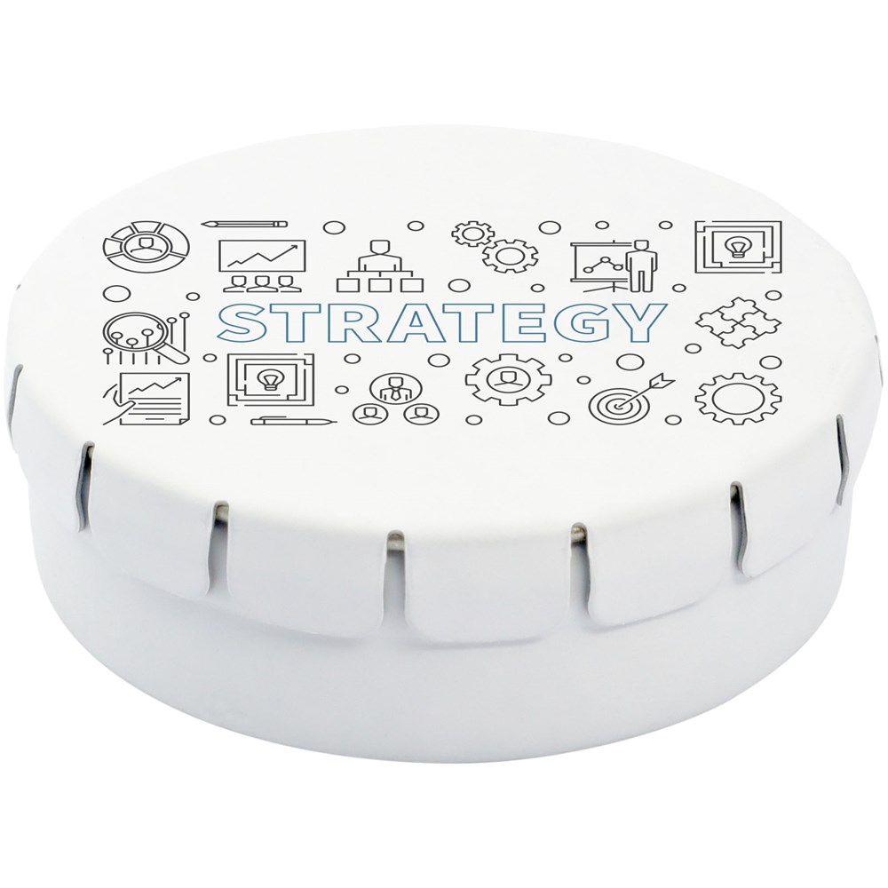 Natuurlijke pepermuntjes in blik met gemakkelijke drukopening. Kan worden besteld in een breed scala van kleuren en gevuld met verschillende vullingen: pepermunt, extra sterke pepermunt, suikervrije pepermunt, fruitsmaak, hartvormige aardbeiensnoepjes, kaneel-, citroen- en pepermuntsmaak, of chocolade. Kan worden gedecoreerd met een full colour digitale print op het deksel.