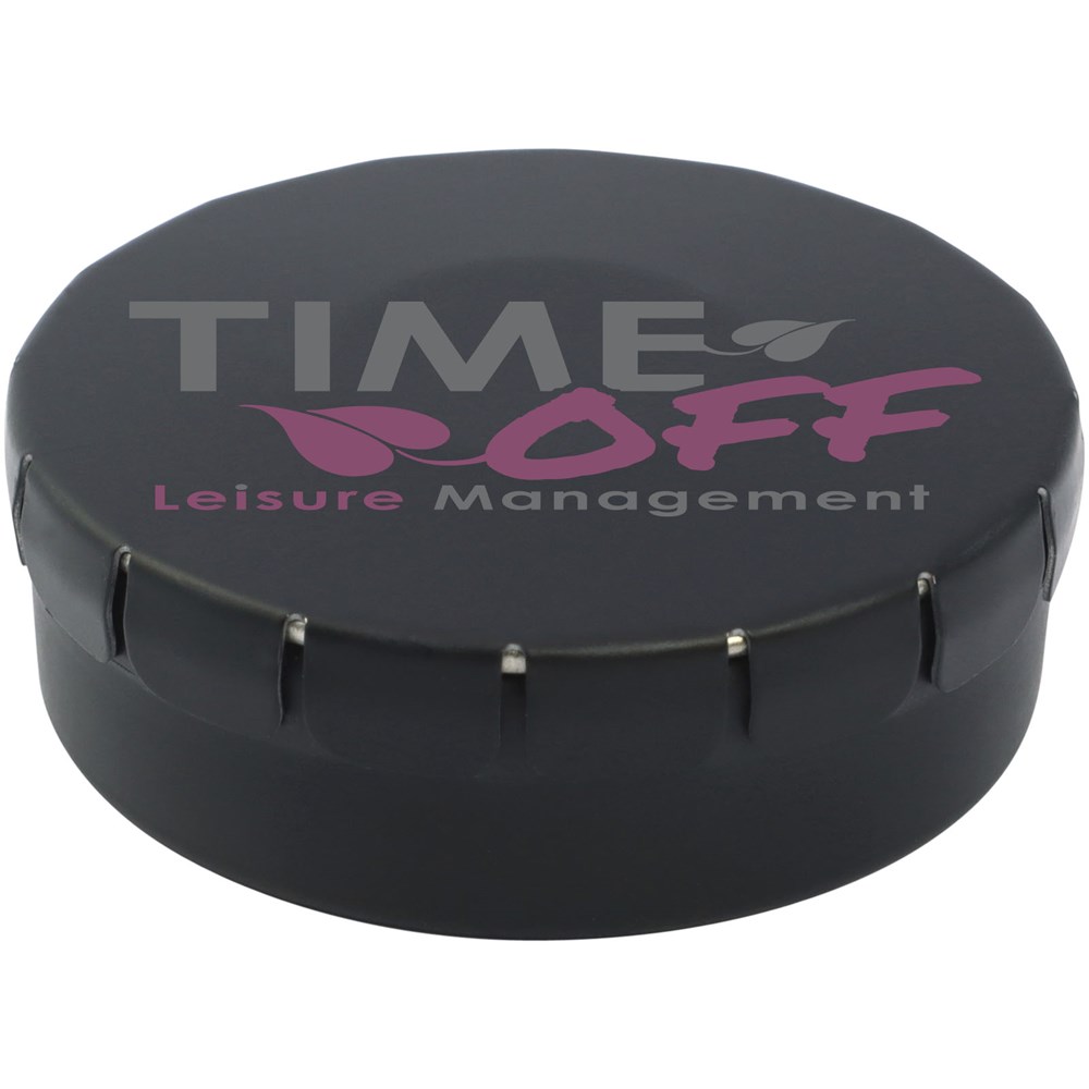 Suikervrije pepermunt in blik met gemakkelijke drukopening. Kan worden besteld in een breed scala van kleuren en gevuld met verschillende vullingen: pepermunt, extra sterke pepermunt, suikervrije pepermunt, fruitsmaak, hartvormige aardbeiensnoepjes, kaneel-, citroen- en pepermuntsmaak of chocolade. Kan worden gedecoreerd met een full colour digitale print op het deksel.