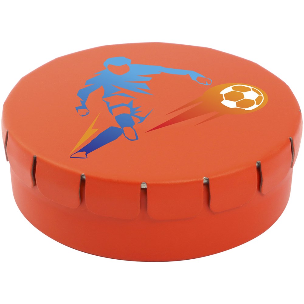 Suikervrije pepermunt in blik met gemakkelijke drukopening. Kan worden besteld in een breed scala van kleuren en gevuld met verschillende vullingen: pepermunt, extra sterke pepermunt, suikervrije pepermunt, fruitsmaak, hartvormige aardbeiensnoepjes, kaneel-, citroen- en pepermuntsmaak of chocolade. Kan worden gedecoreerd met een full colour digitale print op het deksel.