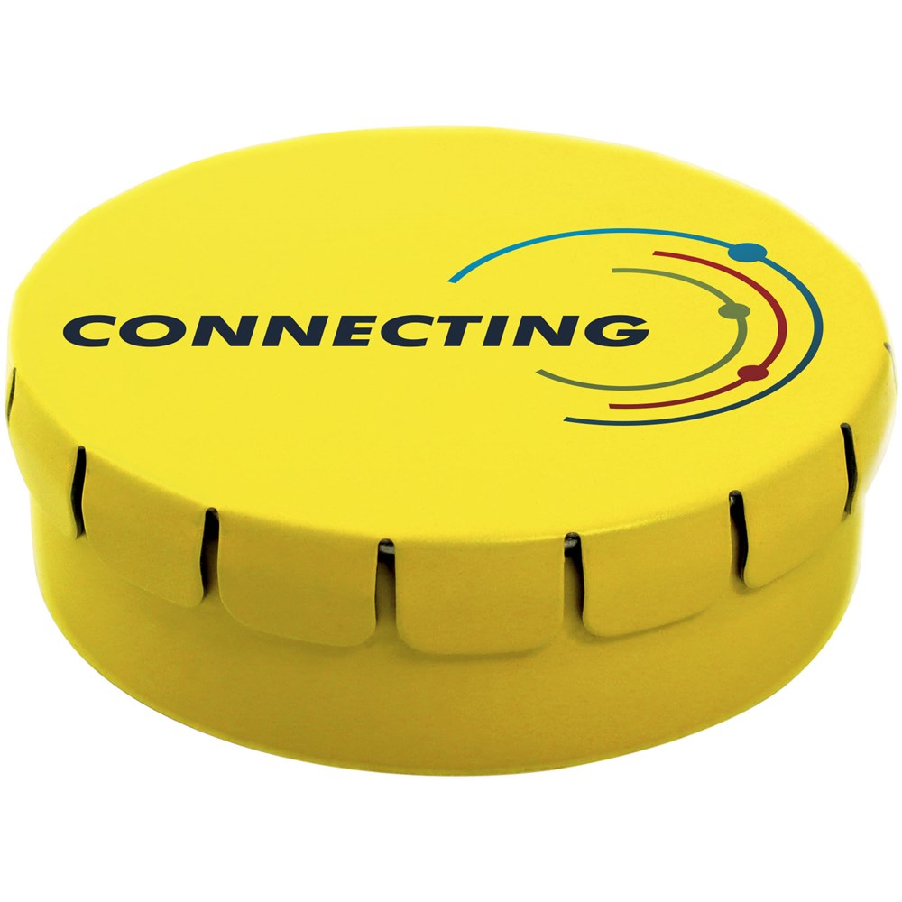 Extra sterke pepermunt in blik met gemakkelijke drukopening. Kan worden besteld in een breed scala van kleuren en gevuld met verschillende vullingen: pepermunt, extra sterke pepermunt, suikervrije pepermunt, fruitsmaak, hartvormige aardbeiensnoepjes, kaneel-, citroen- en pepermuntsmaak, of chocolade. Kan worden gedecoreerd met een full colour digitale print op het deksel.