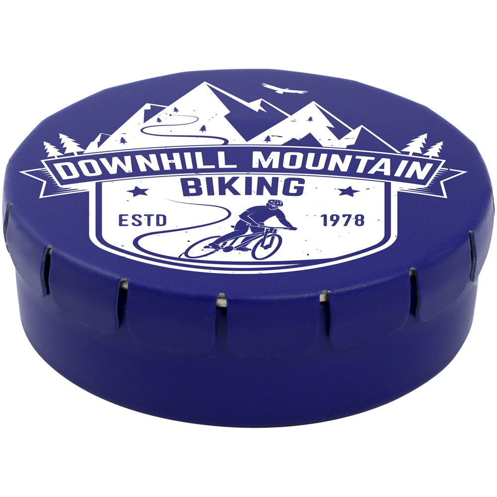 Extra sterke pepermunt in blik met gemakkelijke drukopening. Kan worden besteld in een breed scala van kleuren en gevuld met verschillende vullingen: pepermunt, extra sterke pepermunt, suikervrije pepermunt, fruitsmaak, hartvormige aardbeiensnoepjes, kaneel-, citroen- en pepermuntsmaak, of chocolade. Kan worden gedecoreerd met een full colour digitale print op het deksel.