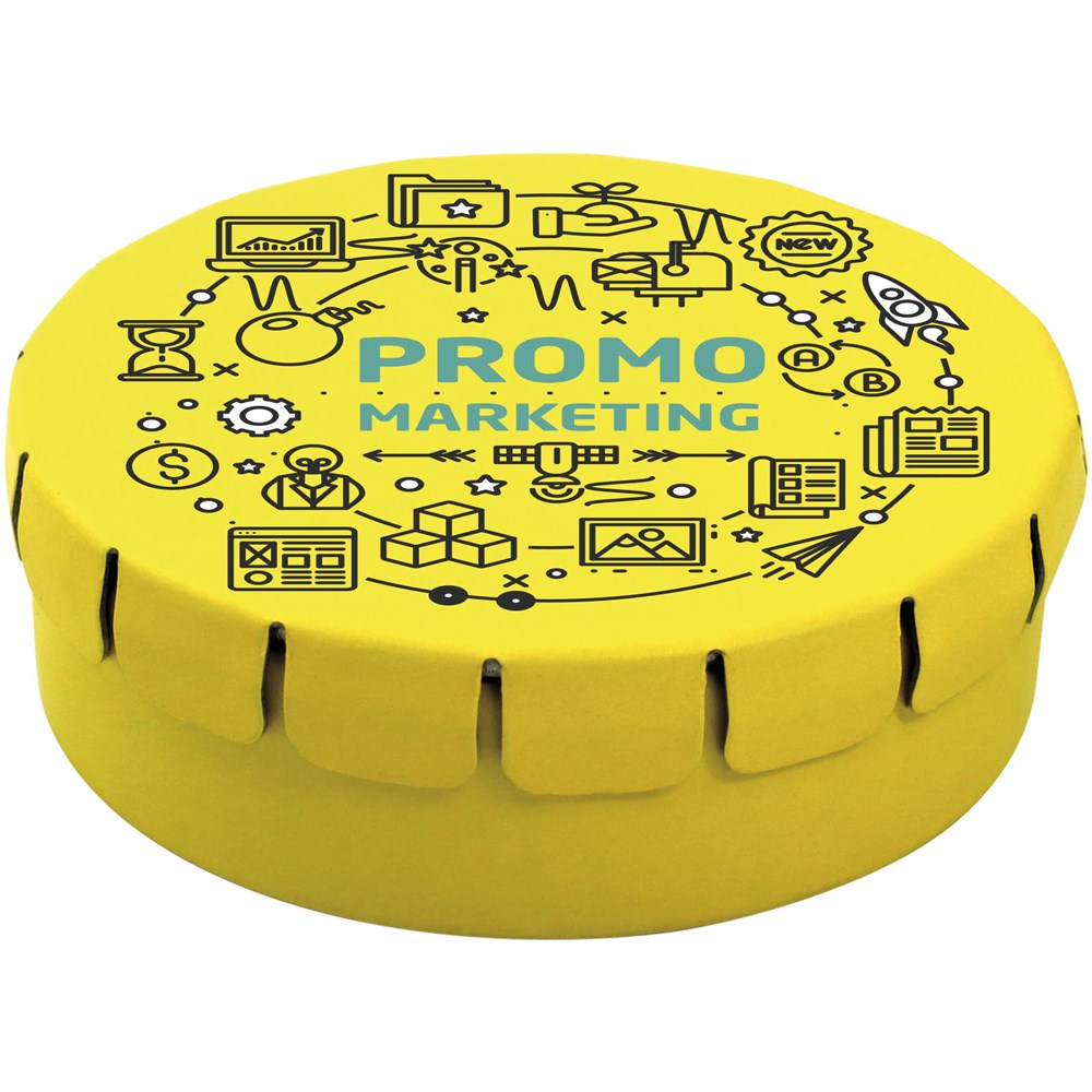 Extra sterke pepermunt in blik met gemakkelijke drukopening. Kan worden besteld in een breed scala van kleuren en gevuld met verschillende vullingen: pepermunt, extra sterke pepermunt, suikervrije pepermunt, fruitsmaak, hartvormige aardbeiensnoepjes, kaneel-, citroen- en pepermuntsmaak, of chocolade. Kan worden gedecoreerd met een full colour digitale print op het deksel.