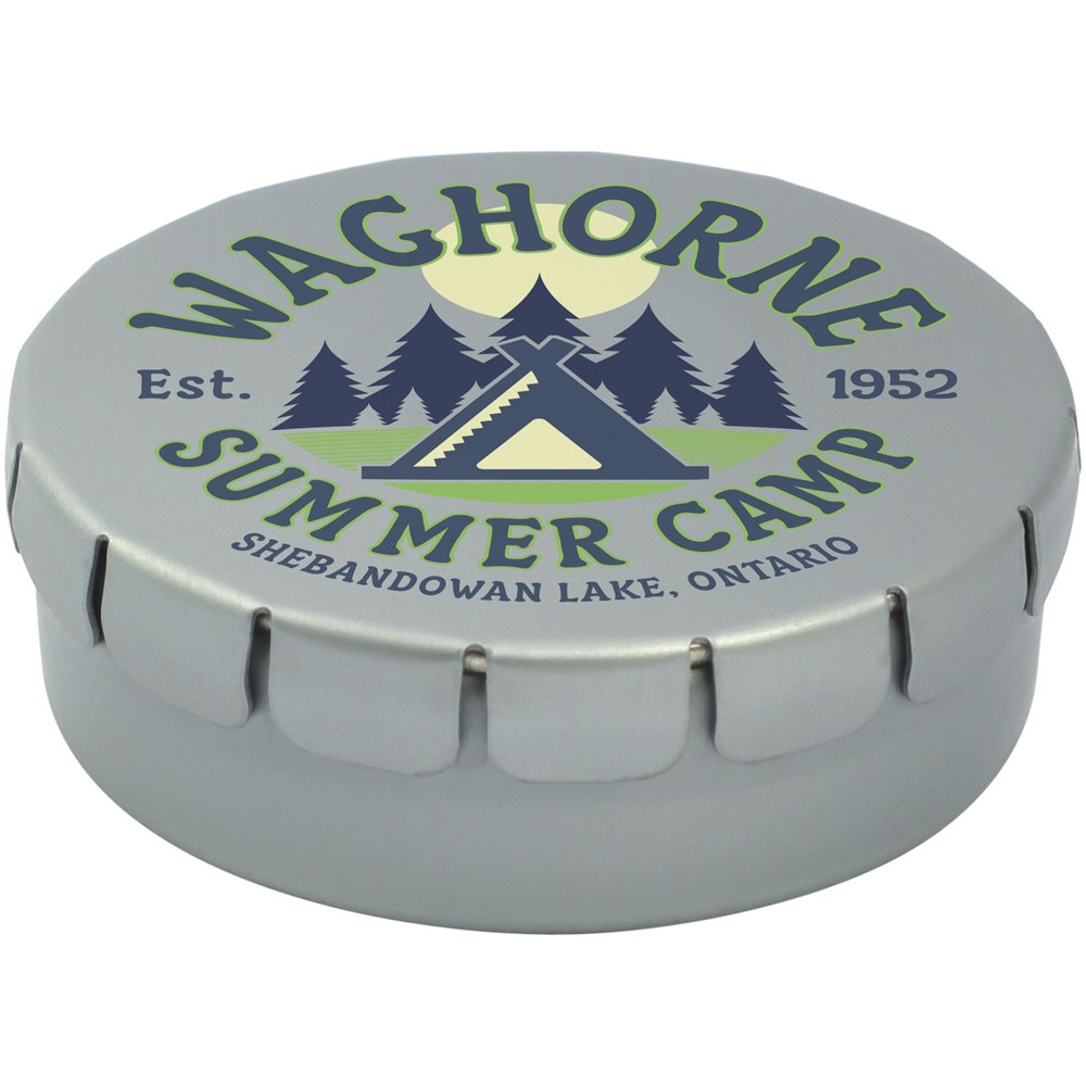 Extra sterke pepermunt in blik met gemakkelijke drukopening. Kan worden besteld in een breed scala van kleuren en gevuld met verschillende vullingen: pepermunt, extra sterke pepermunt, suikervrije pepermunt, fruitsmaak, hartvormige aardbeiensnoepjes, kaneel-, citroen- en pepermuntsmaak, of chocolade. Kan worden gedecoreerd met een full colour digitale print op het deksel.