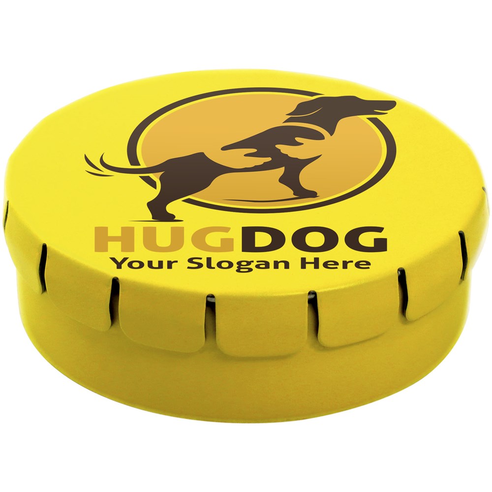 Snoepjes met fruitsmaak in blik met gemakkelijke drukopening. Kan worden besteld in een breed scala van kleuren en gevuld met verschillende vullingen: pepermunt, extra sterke pepermunt, suikervrije pepermunt, fruitsmaak, hartvormige aardbeiensnoepjes, kaneel-, citroen- en pepermuntsmaak, of chocolade. Kan worden gedecoreerd met een full colour digitale print op het deksel.