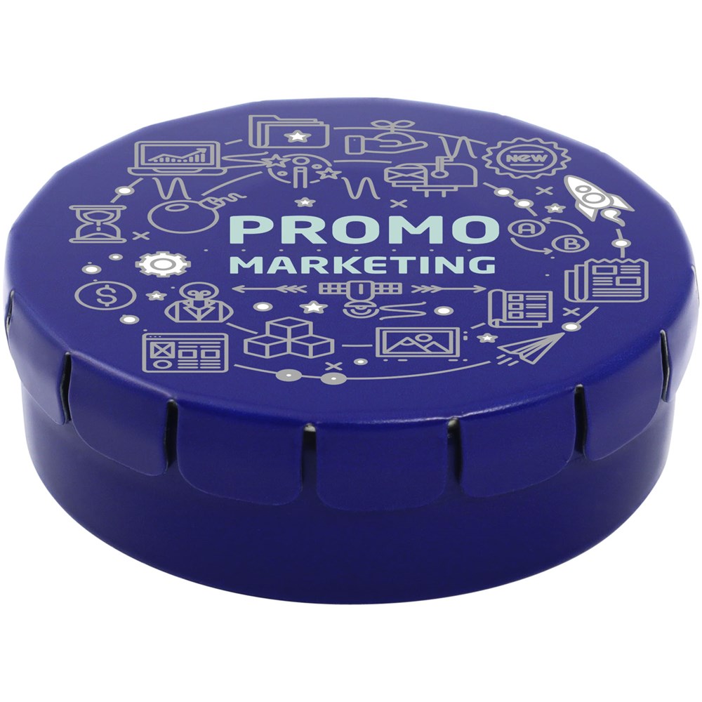 Snoepjes met fruitsmaak in blik met gemakkelijke drukopening. Kan worden besteld in een breed scala van kleuren en gevuld met verschillende vullingen: pepermunt, extra sterke pepermunt, suikervrije pepermunt, fruitsmaak, hartvormige aardbeiensnoepjes, kaneel-, citroen- en pepermuntsmaak, of chocolade. Kan worden gedecoreerd met een full colour digitale print op het deksel.