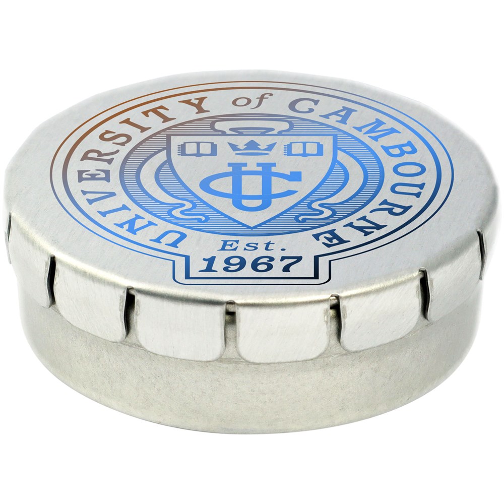 Snoepjes met fruitsmaak in blik met gemakkelijke drukopening. Kan worden besteld in een breed scala van kleuren en gevuld met verschillende vullingen: pepermunt, extra sterke pepermunt, suikervrije pepermunt, fruitsmaak, hartvormige aardbeiensnoepjes, kaneel-, citroen- en pepermuntsmaak, of chocolade. Kan worden gedecoreerd met een full colour digitale print op het deksel.