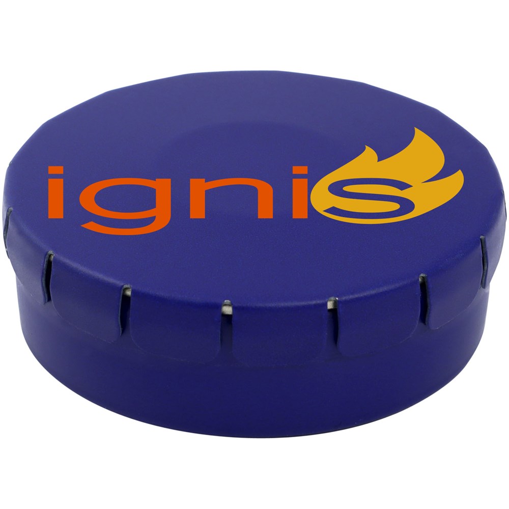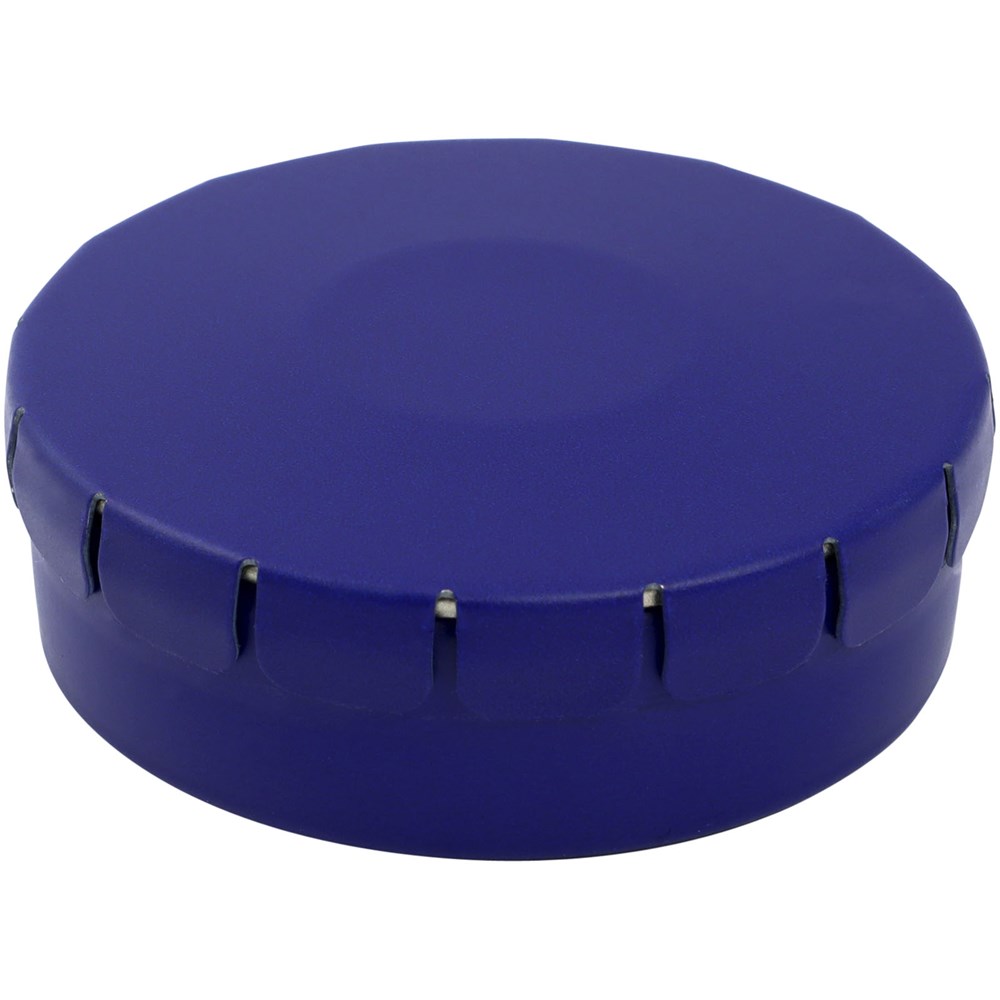 Snoepjes met fruitsmaak in blik met gemakkelijke drukopening. Kan worden besteld in een breed scala van kleuren en gevuld met verschillende vullingen: pepermunt, extra sterke pepermunt, suikervrije pepermunt, fruitsmaak, hartvormige aardbeiensnoepjes, kaneel-, citroen- en pepermuntsmaak, of chocolade. Kan worden gedecoreerd met een full colour digitale print op het deksel.