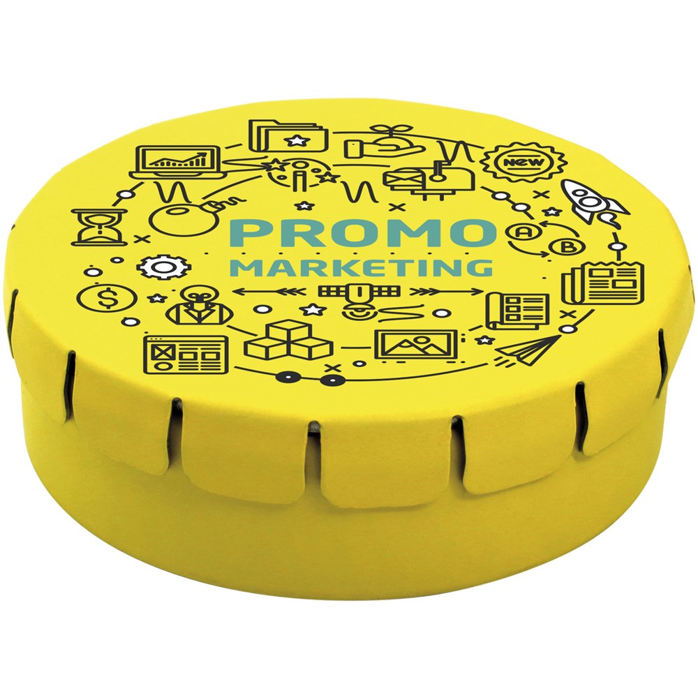Snoepjes met fruitsmaak in blik met gemakkelijke drukopening. Kan worden besteld in een breed scala van kleuren en gevuld met verschillende vullingen: pepermunt, extra sterke pepermunt, suikervrije pepermunt, fruitsmaak, hartvormige aardbeiensnoepjes, kaneel-, citroen- en pepermuntsmaak, of chocolade. Kan worden gedecoreerd met een full colour digitale print op het deksel.