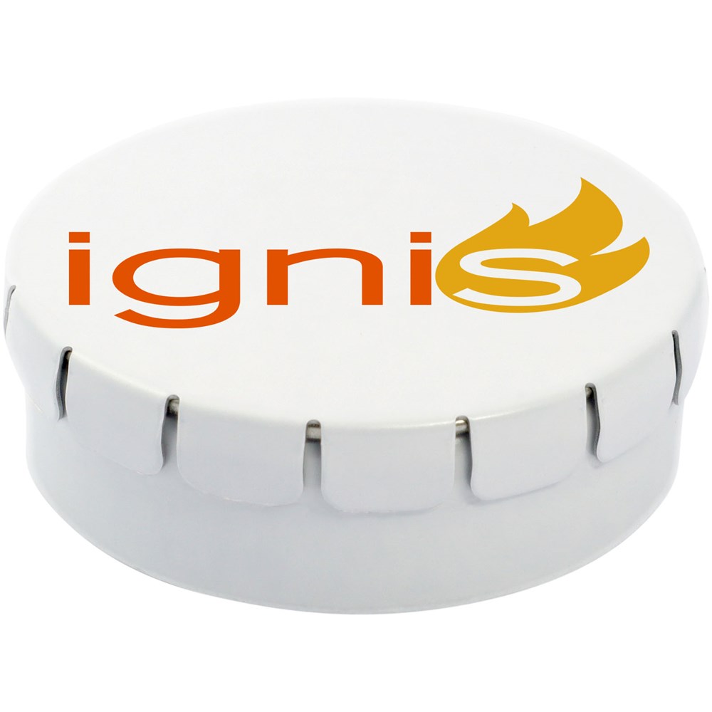 Snoepjes met kaneelsmaak in blik met gemakkelijke drukopening. Kan worden besteld in een breed scala van kleuren en gevuld met verschillende vullingen: pepermunt, extra sterke pepermunt suikervrije pepermunt, fruitsmaak, hartvormige aardbeiensnoepjes, kaneel-, citroen- en pepermuntsmaak, of chocolade. Kan worden gedecoreerd met een full colour digitale print op het deksel.