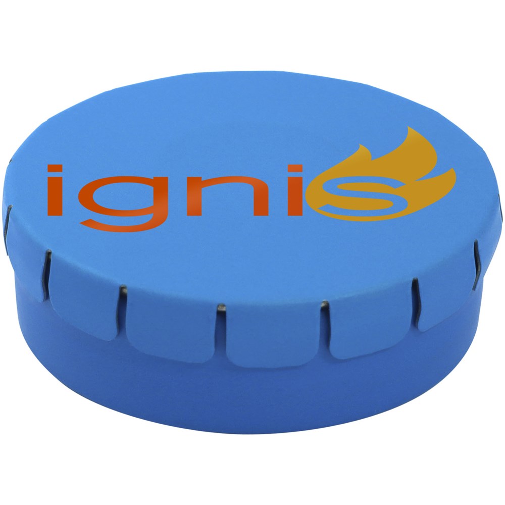 Snoepjes met kaneelsmaak in blik met gemakkelijke drukopening. Kan worden besteld in een breed scala van kleuren en gevuld met verschillende vullingen: pepermunt, extra sterke pepermunt suikervrije pepermunt, fruitsmaak, hartvormige aardbeiensnoepjes, kaneel-, citroen- en pepermuntsmaak, of chocolade. Kan worden gedecoreerd met een full colour digitale print op het deksel.