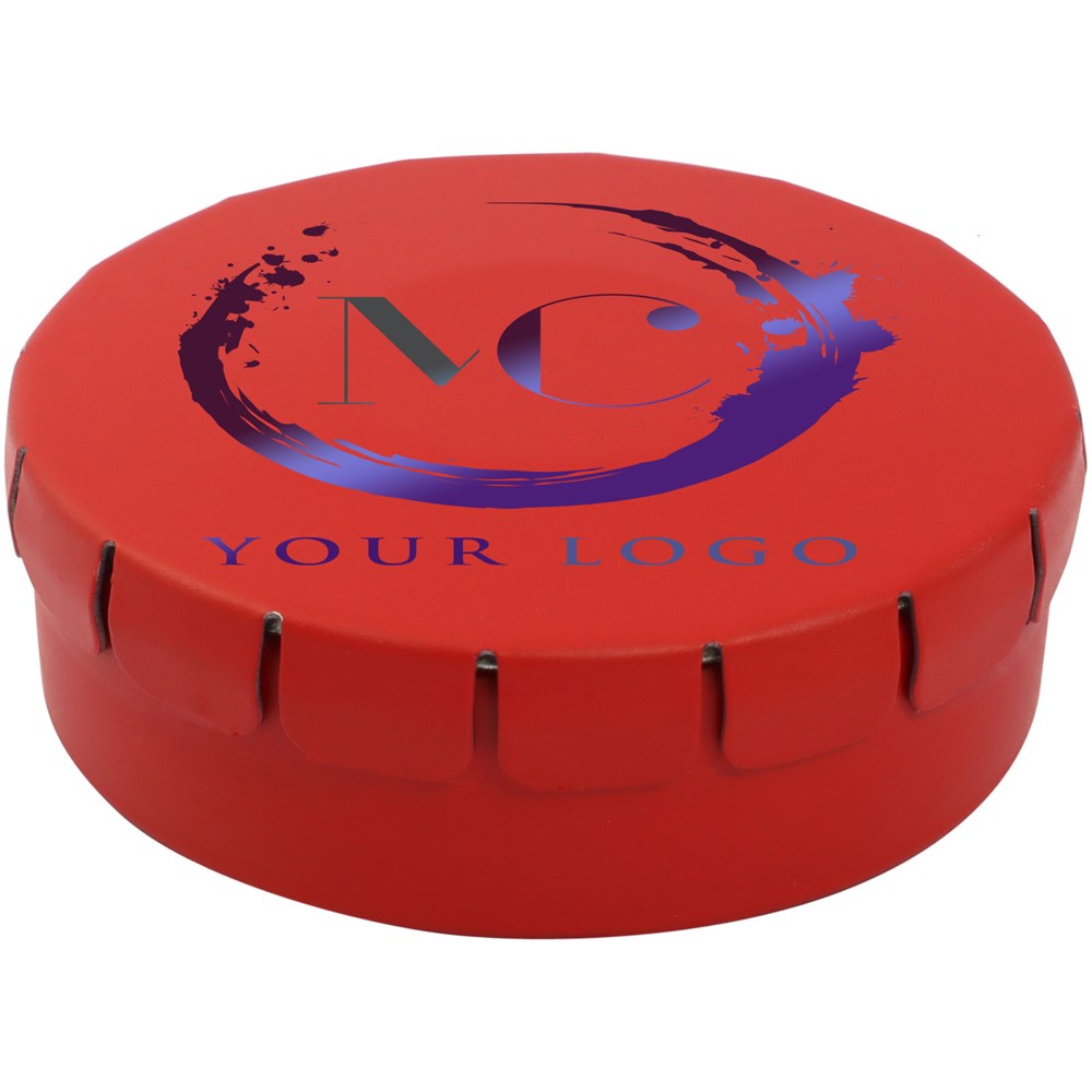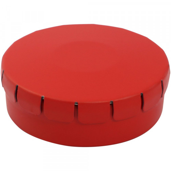 Snoepjes met kaneelsmaak in blik met gemakkelijke drukopening. Kan worden besteld in een breed scala van kleuren en gevuld met verschillende vullingen: pepermunt, extra sterke pepermunt suikervrije pepermunt, fruitsmaak, hartvormige aardbeiensnoepjes, kaneel-, citroen- en pepermuntsmaak, of chocolade. Kan worden gedecoreerd met een full colour digitale print op het deksel.