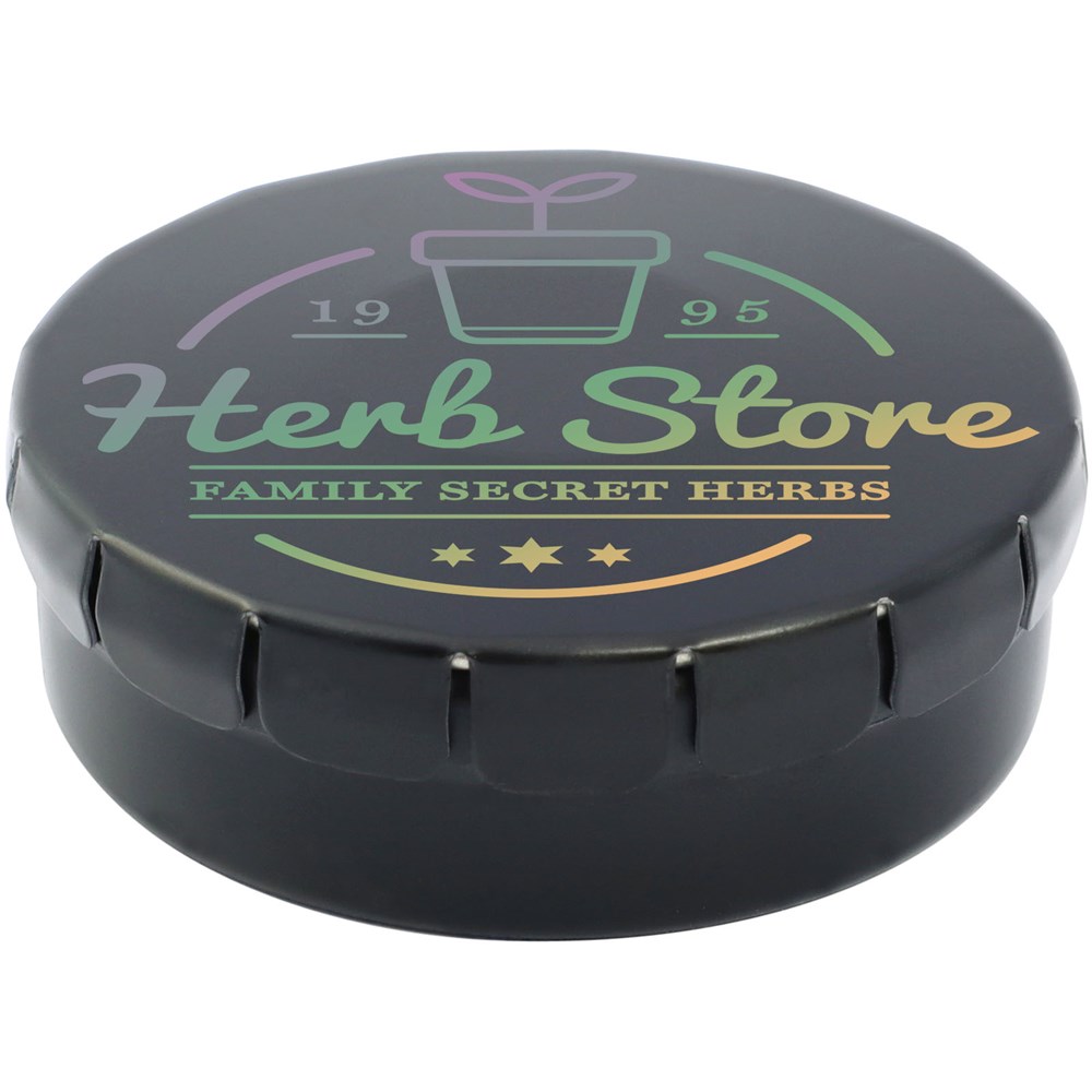 Hartvormige aardbeiensnoepjes in blik met gemakkelijke drukopening. Kan worden besteld in een breed scala van kleuren en gevuld met verschillende vullingen: pepermunt, extra sterke pepermunt, suikervrije pepermunt, fruitsmaak, hartvormige aardbeiensnoepjes, kaneel-, citroen- en pepermuntsmaak, of chocolade. Kan worden gedecoreerd met een full colour digitale print op het deksel.