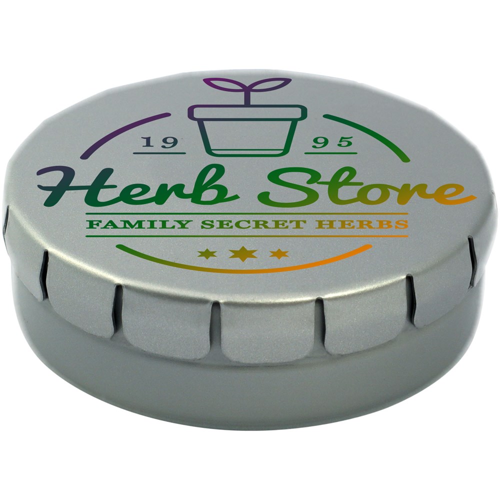 Snoepjes met citroen- en pepermuntsmaak in blik met gemakkelijke drukopening. Kan worden besteld in een breed scala van kleuren en gevuld met verschillende vullingen: pepermunt, extra sterke pepermunt, suikervrije pepermunt, fruitsmaak, hartvormige aardbeiensnoepjes, kaneel-, citroen- en pepermuntsmaak, of chocolade. Kan worden gedecoreerd met een full colour digitale print op het deksel.