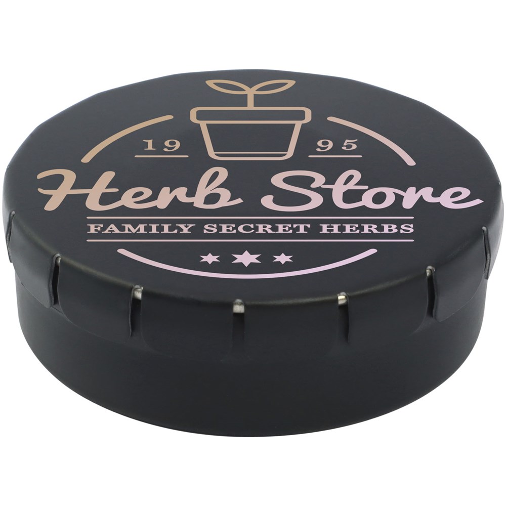 Snoepjes met citroen- en pepermuntsmaak in blik met gemakkelijke drukopening. Kan worden besteld in een breed scala van kleuren en gevuld met verschillende vullingen: pepermunt, extra sterke pepermunt, suikervrije pepermunt, fruitsmaak, hartvormige aardbeiensnoepjes, kaneel-, citroen- en pepermuntsmaak, of chocolade. Kan worden gedecoreerd met een full colour digitale print op het deksel.