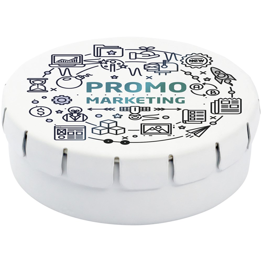 Snoepjes met citroen- en pepermuntsmaak in blik met gemakkelijke drukopening. Kan worden besteld in een breed scala van kleuren en gevuld met verschillende vullingen: pepermunt, extra sterke pepermunt, suikervrije pepermunt, fruitsmaak, hartvormige aardbeiensnoepjes, kaneel-, citroen- en pepermuntsmaak, of chocolade. Kan worden gedecoreerd met een full colour digitale print op het deksel.