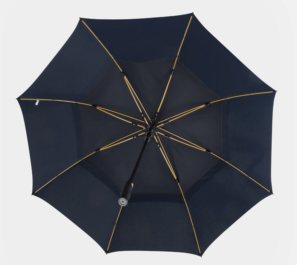 GP-76 FALCONE hoge kwaliteit windproof golfparaplu, automaat. Hoogwaardig oranje glasfiber frame. 210T polyester pongee doek met overlappende panelen om de wind door te laten. Zwart rubber finished handvat, met Falcone doming en met een foedraal.
