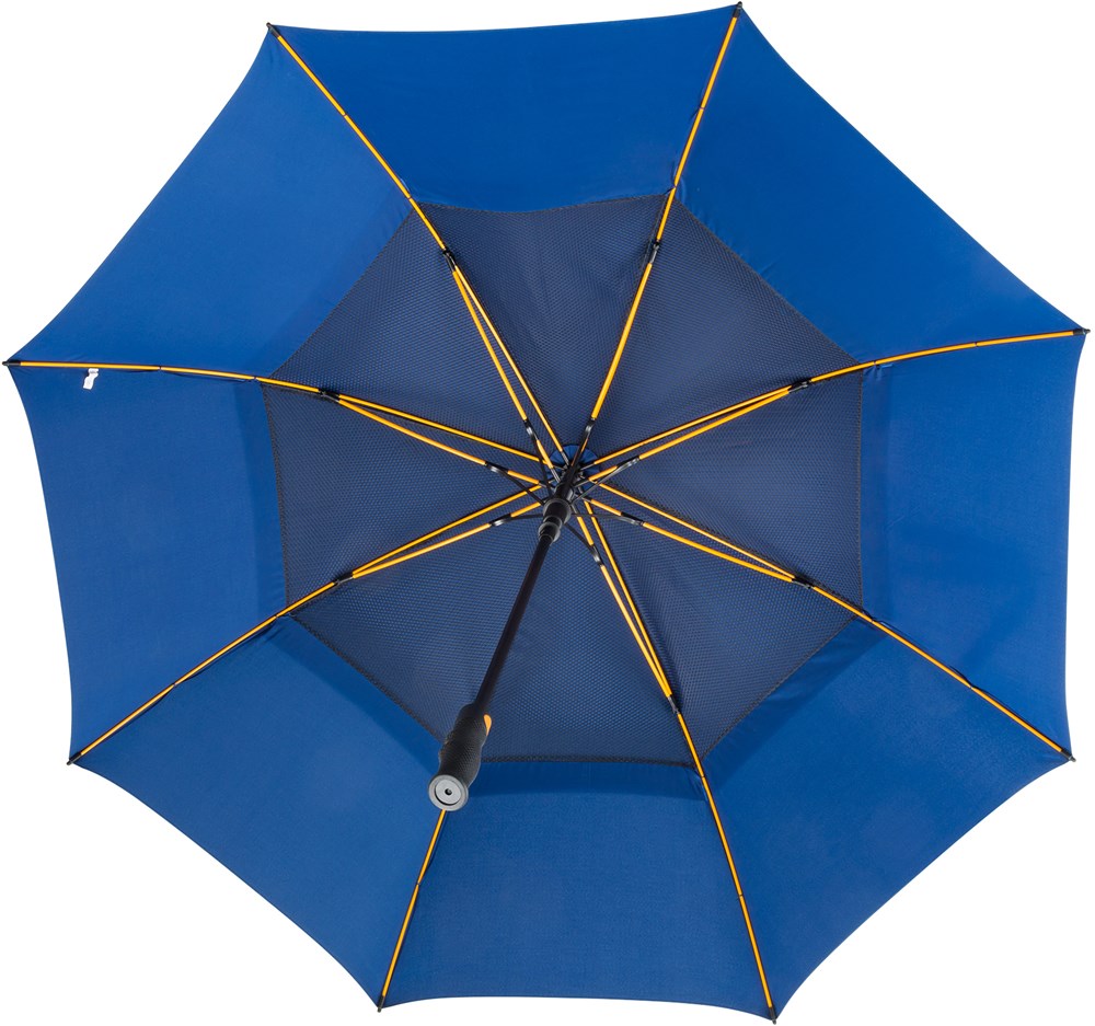 GP-76 FALCONE hoge kwaliteit windproof golfparaplu, automaat. Hoogwaardig oranje glasfiber frame. 210T polyester pongee doek met overlappende panelen om de wind door te laten. Zwart rubber finished handvat, met Falcone doming en met een foedraal.