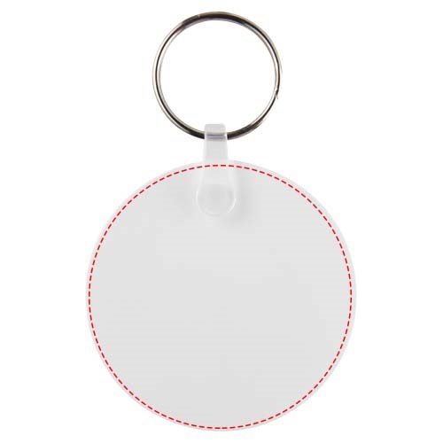 Witte cirkelvormige sleutelhanger met metalen gesplitste sleutelring. De metalen lusring biedt een vlak profiel dat ideaal is voor de post.